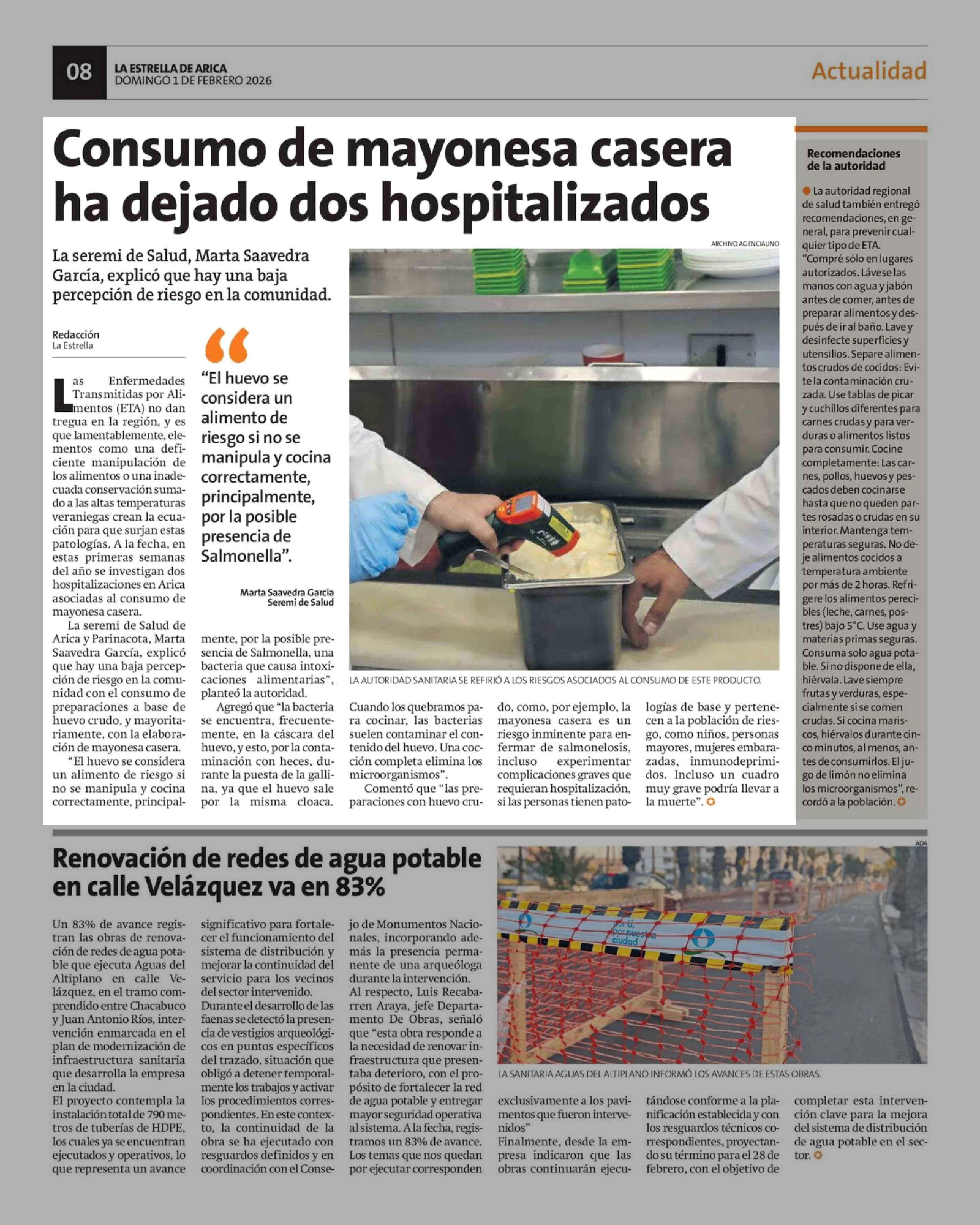 Consumo de mayonesa casera ha dejado dos hospitalizados 01-02-2026 La Estrella de Arica |