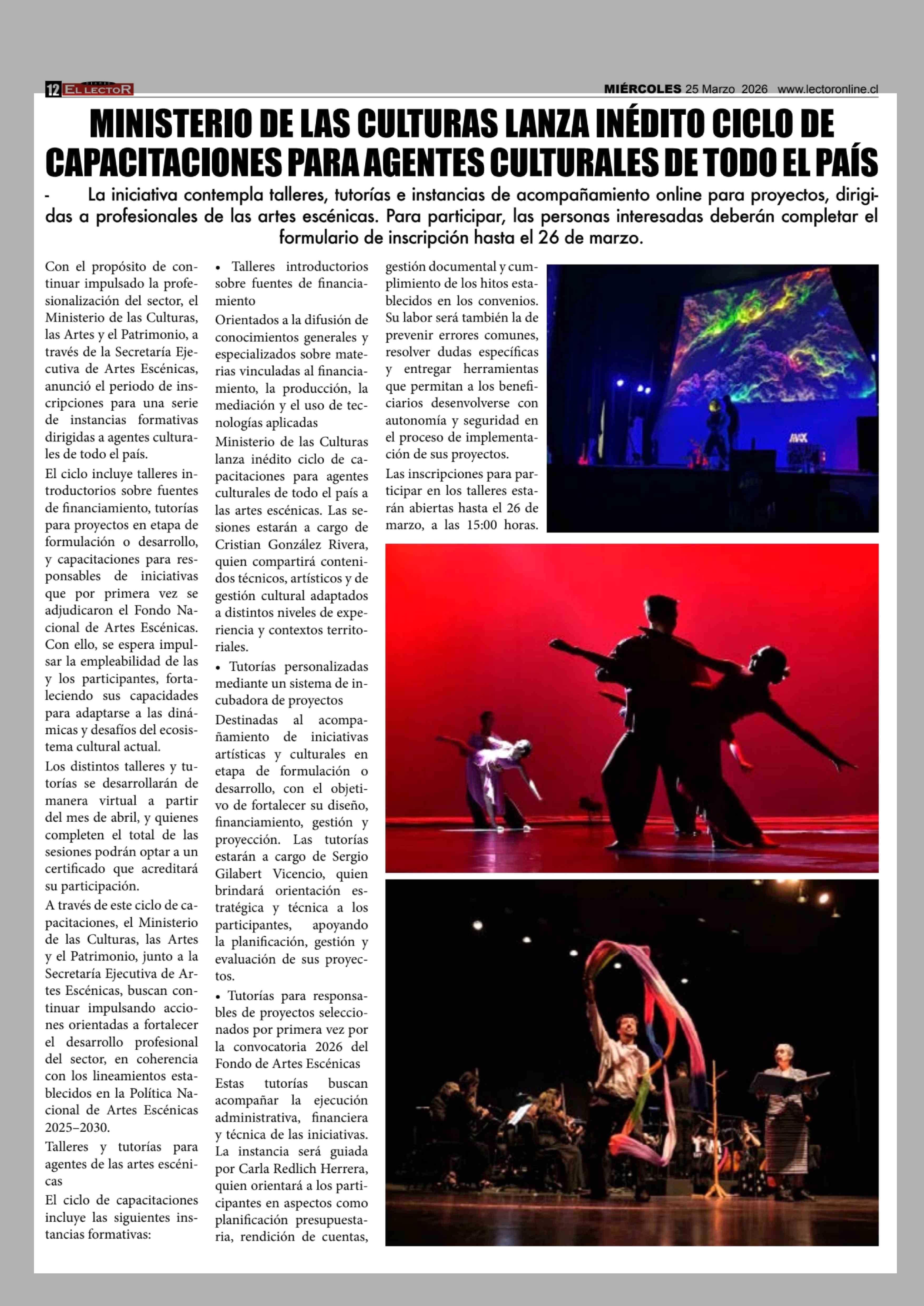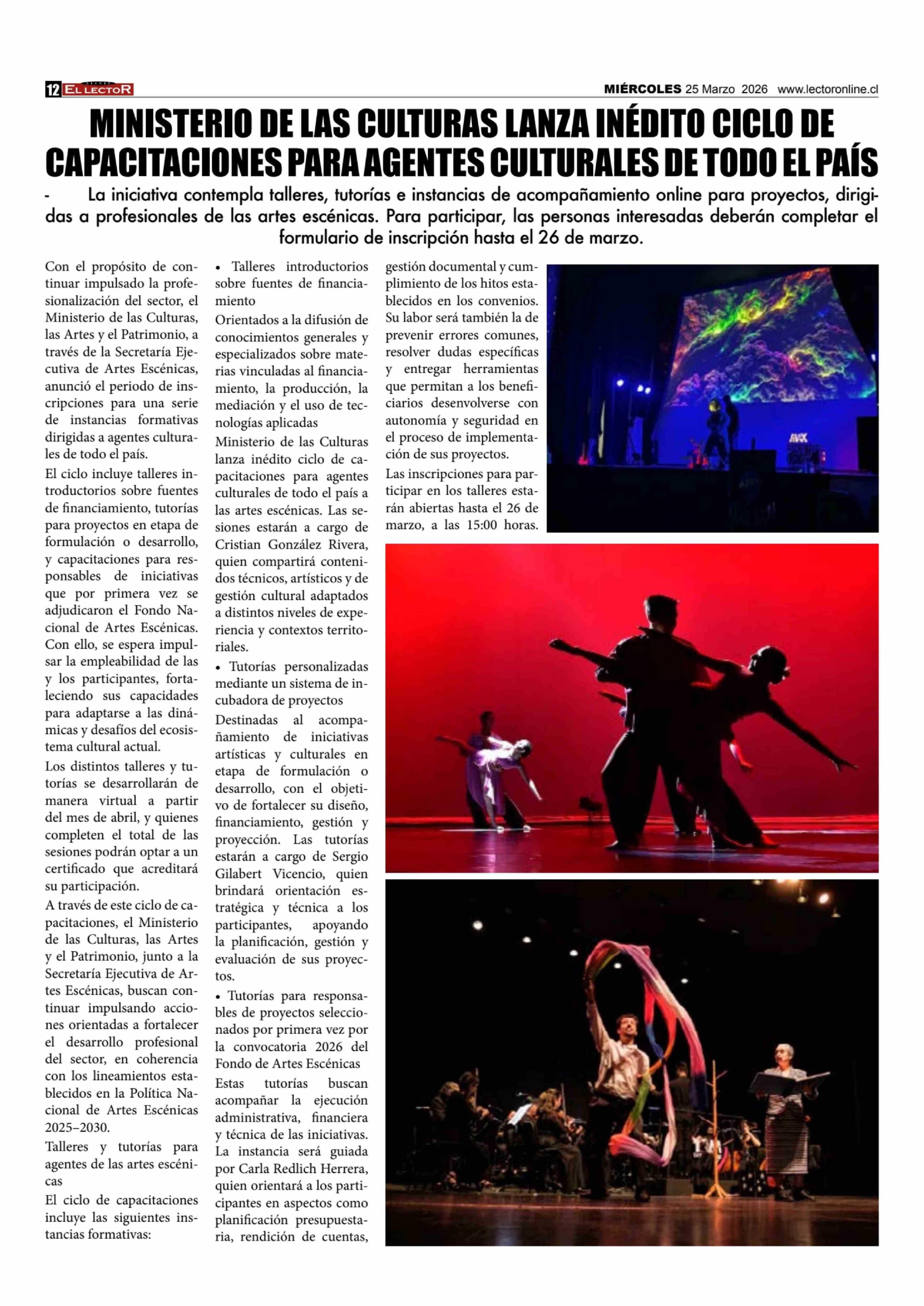 MINISTERIO DE LAS CULTURAS LANZA INÉDITO CICLO DE CAPACITACIONES PARA AGENTES CULTURALES DE TODO EL PAÍS 25-03-2026 El Lector |