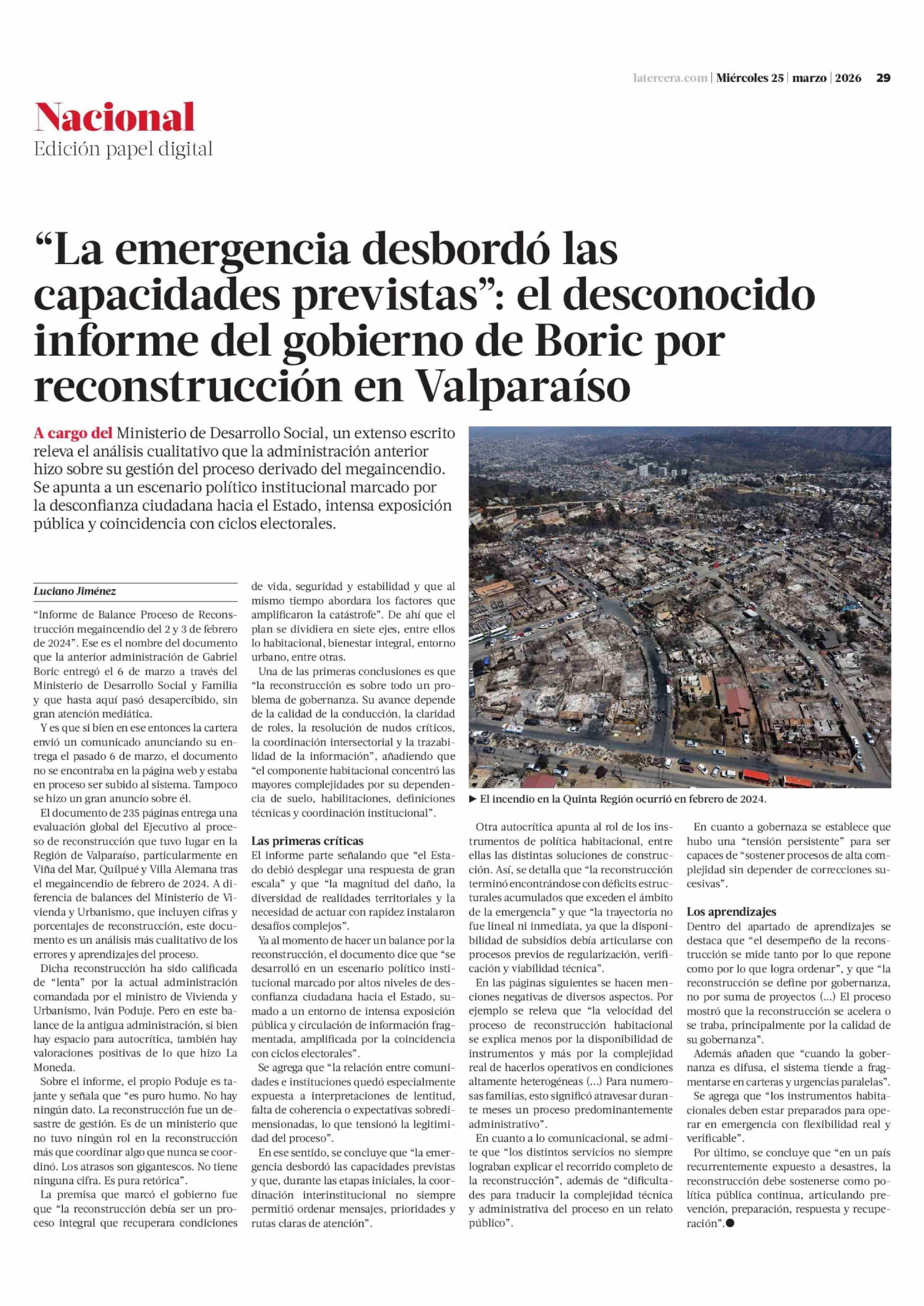 "La emergencia desbordó las capacidades previstas": el desconocido informe del gobierno de Boric por reconstrucción en Valparaíso 25-03-2026 La Tercera |