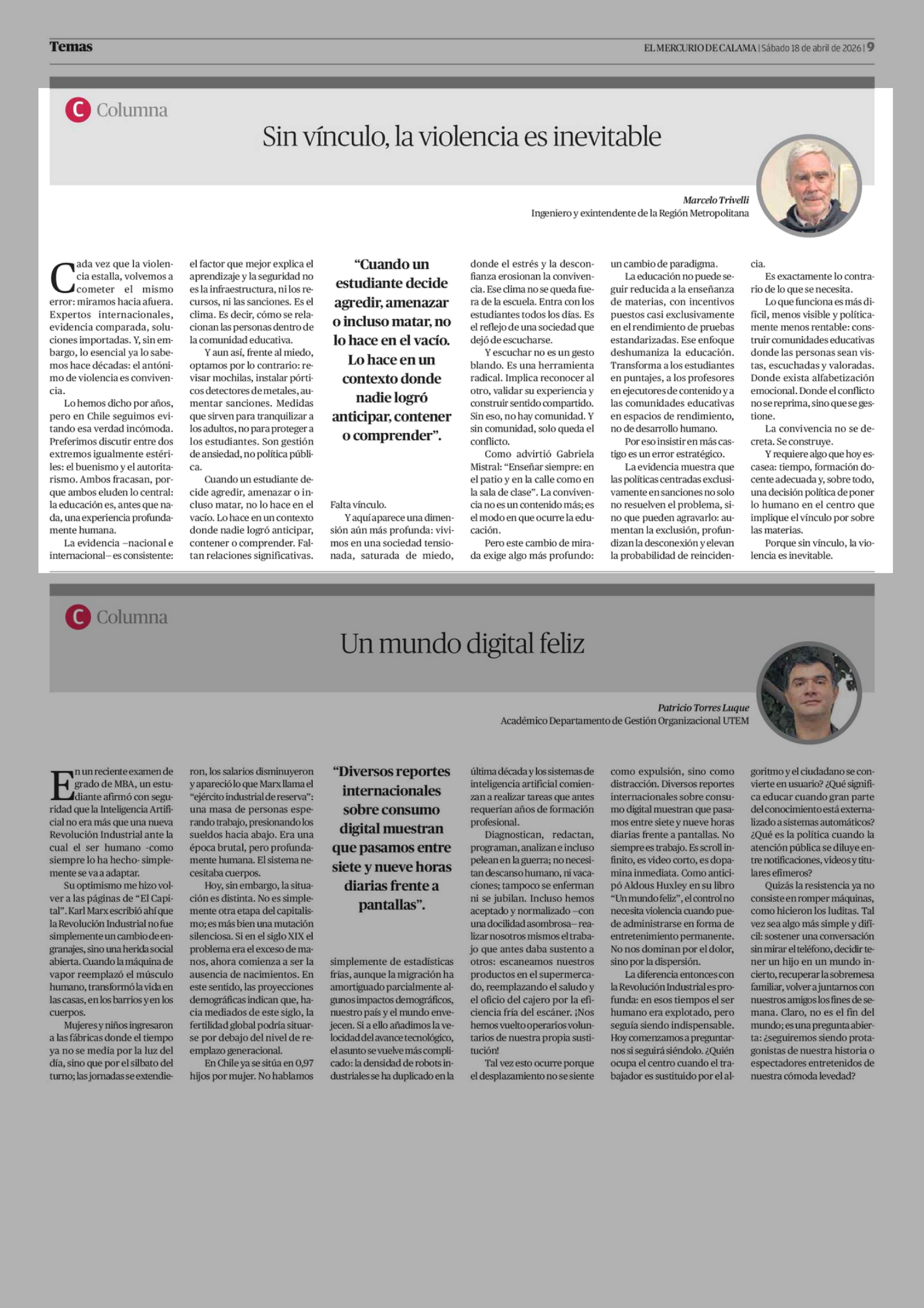 Columnas de Opinión: Sin vínculo, la violencia es inevitable 18-04-2026 El Mercurio de Calama |