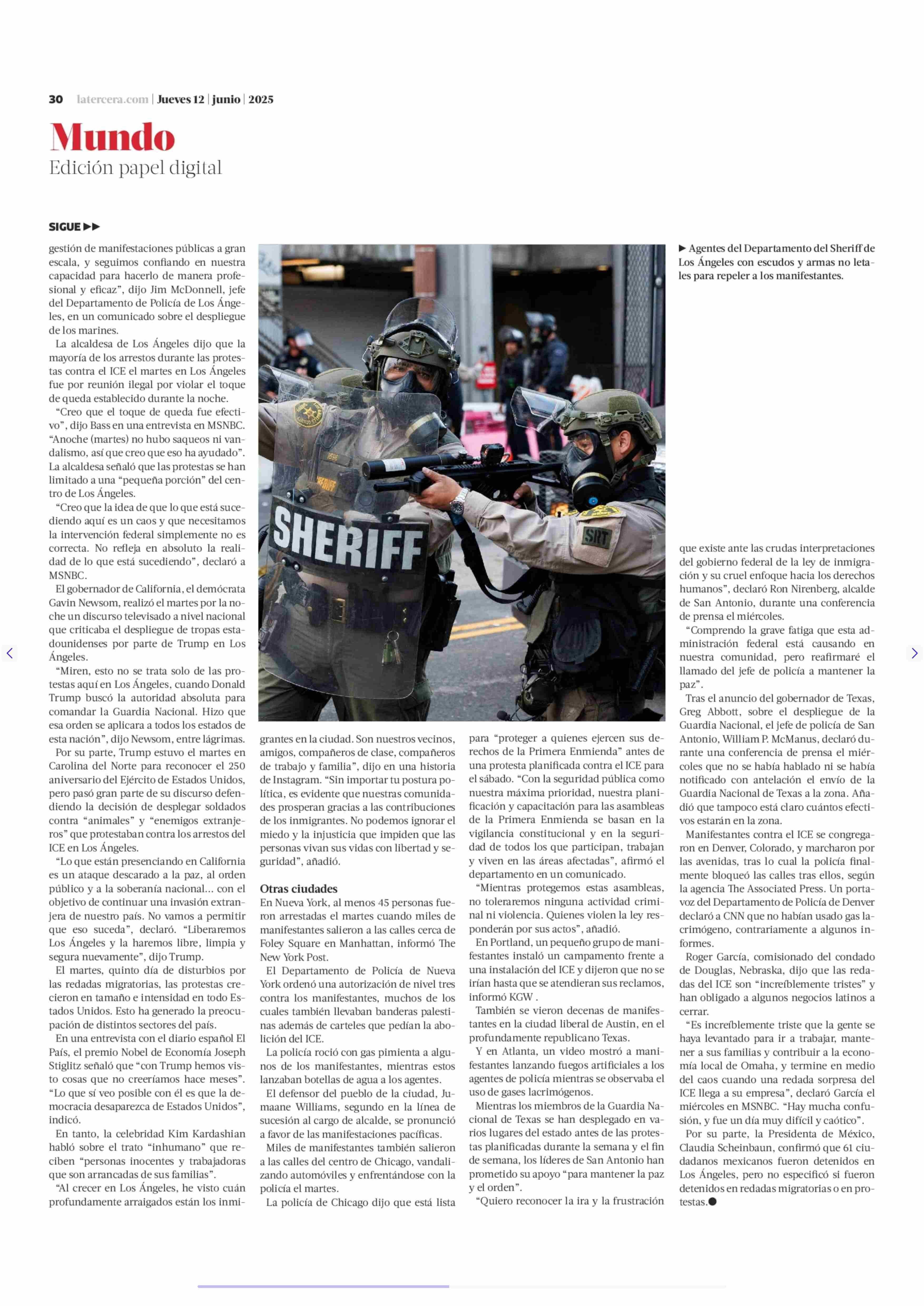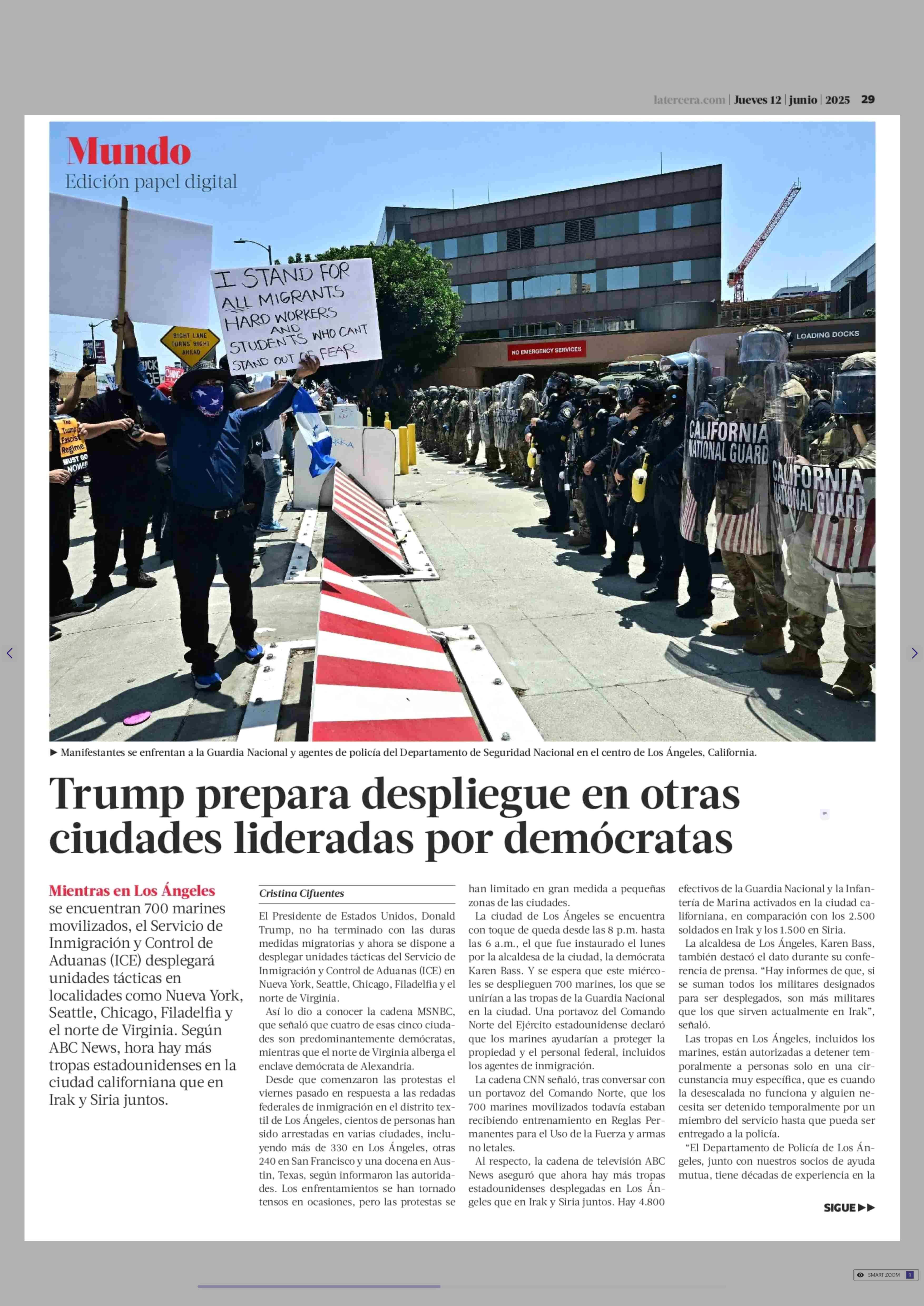 Trump prepara despliegue en otras ciudades lideradas por demócratas 12-06-2025 La Tercera |