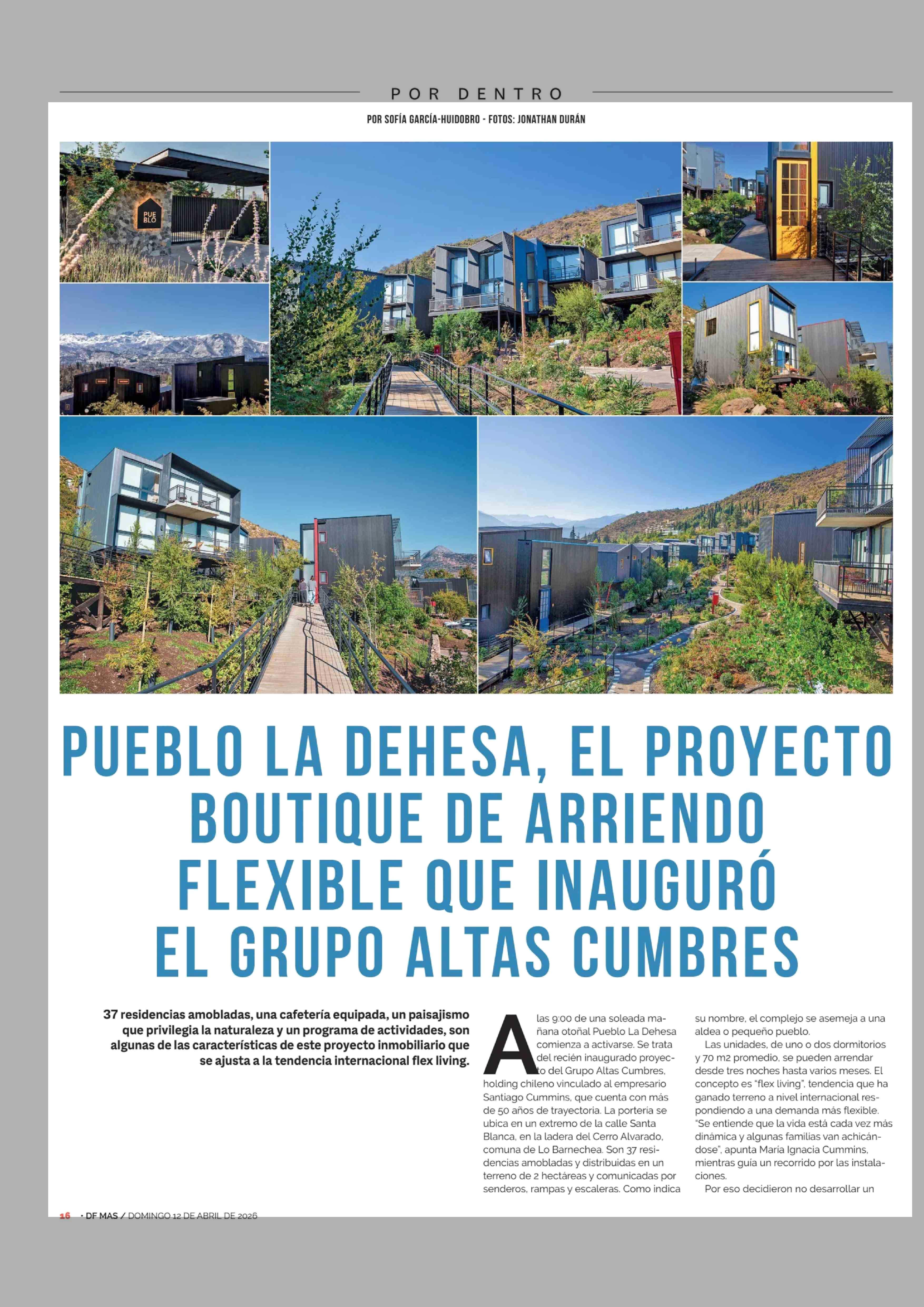 PUEBLO LA DEHESA, EL PROYECTO BOUTIQUE DE ARRIENDO FLEXIBLE QUE INAUGURÓ EL GRUPO ALTAS CUMBRES 12-04-2026 Diario Financiero |