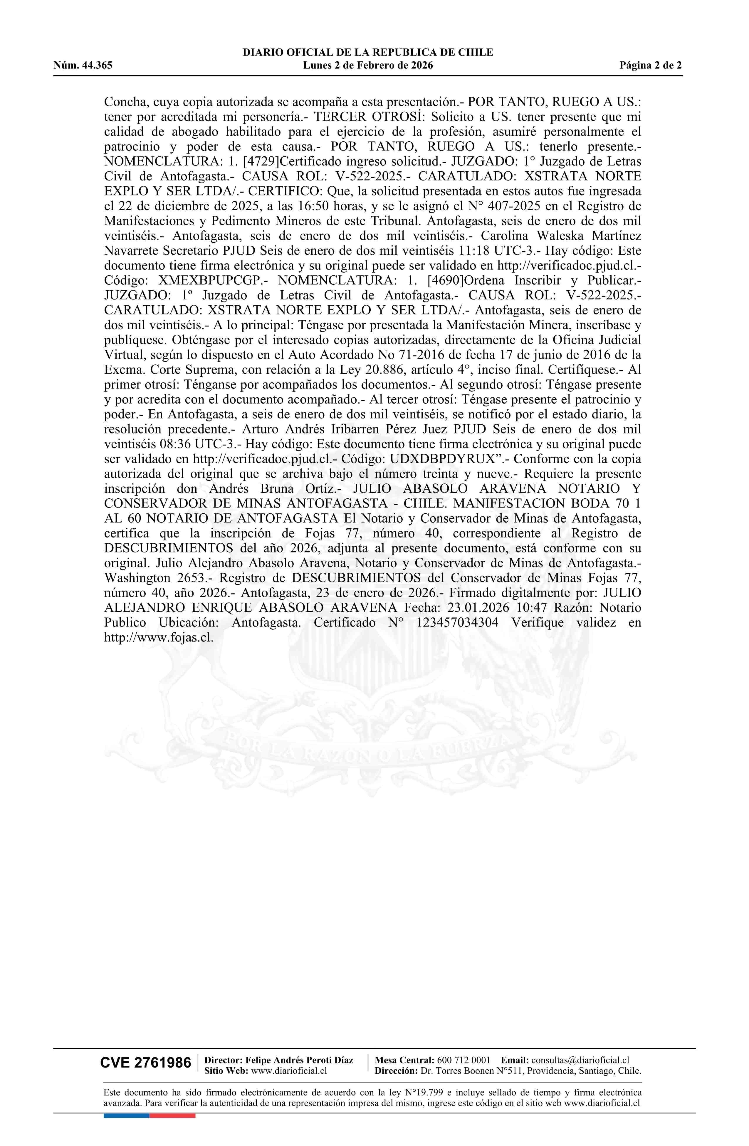 Fuente: DIARIO OFICIAL CHILE - BOLETÍN OFICIAL DE MINERÍA (DIARIO OFICIAL CHILE – BOM – MANIFESTACIONES MIN) Página(s): 20-21