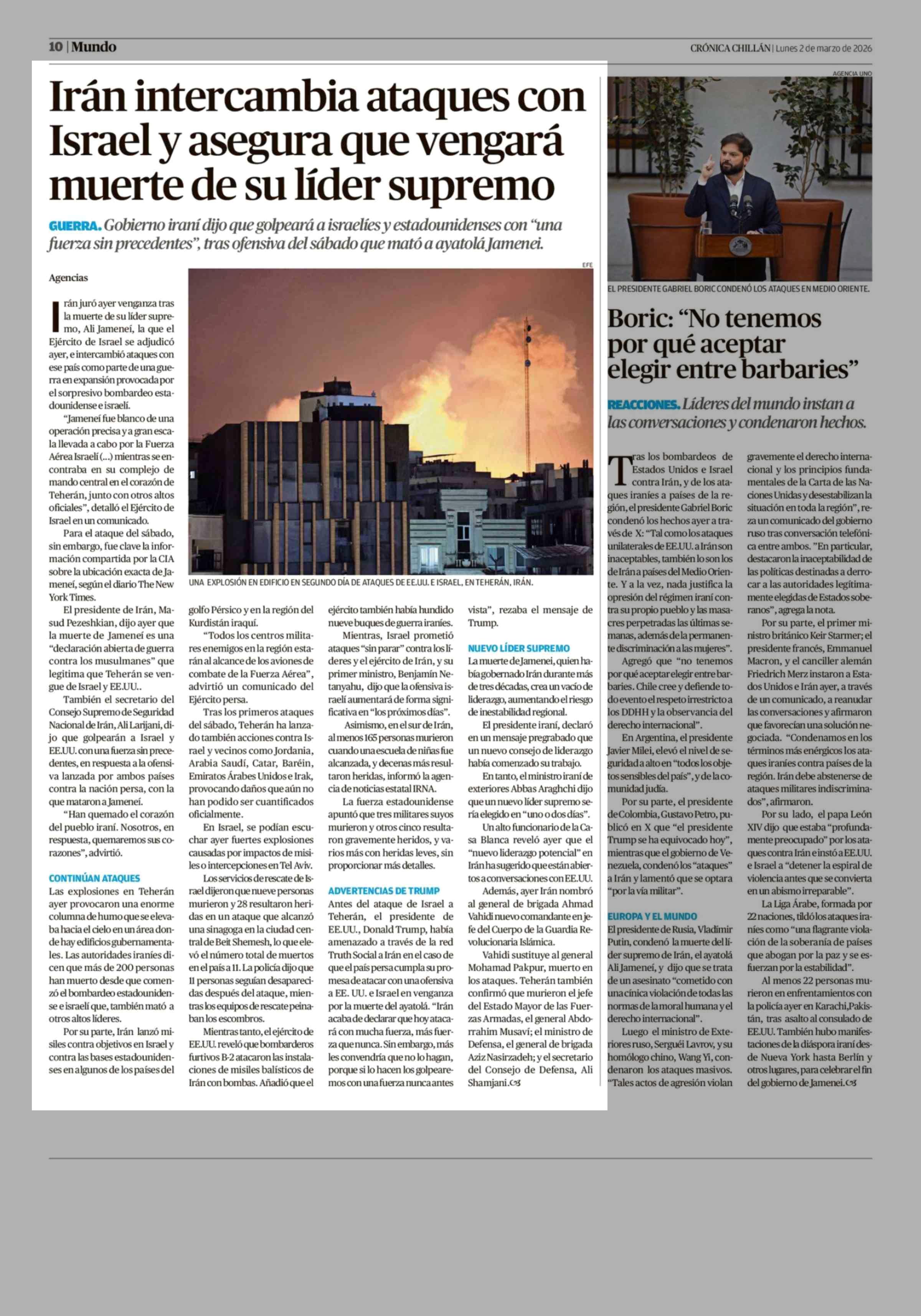 Irán intercambia ataques con Israel y asegura que vengará muerte de su líder supremo 02-03-2026 Crónica de Chillán |