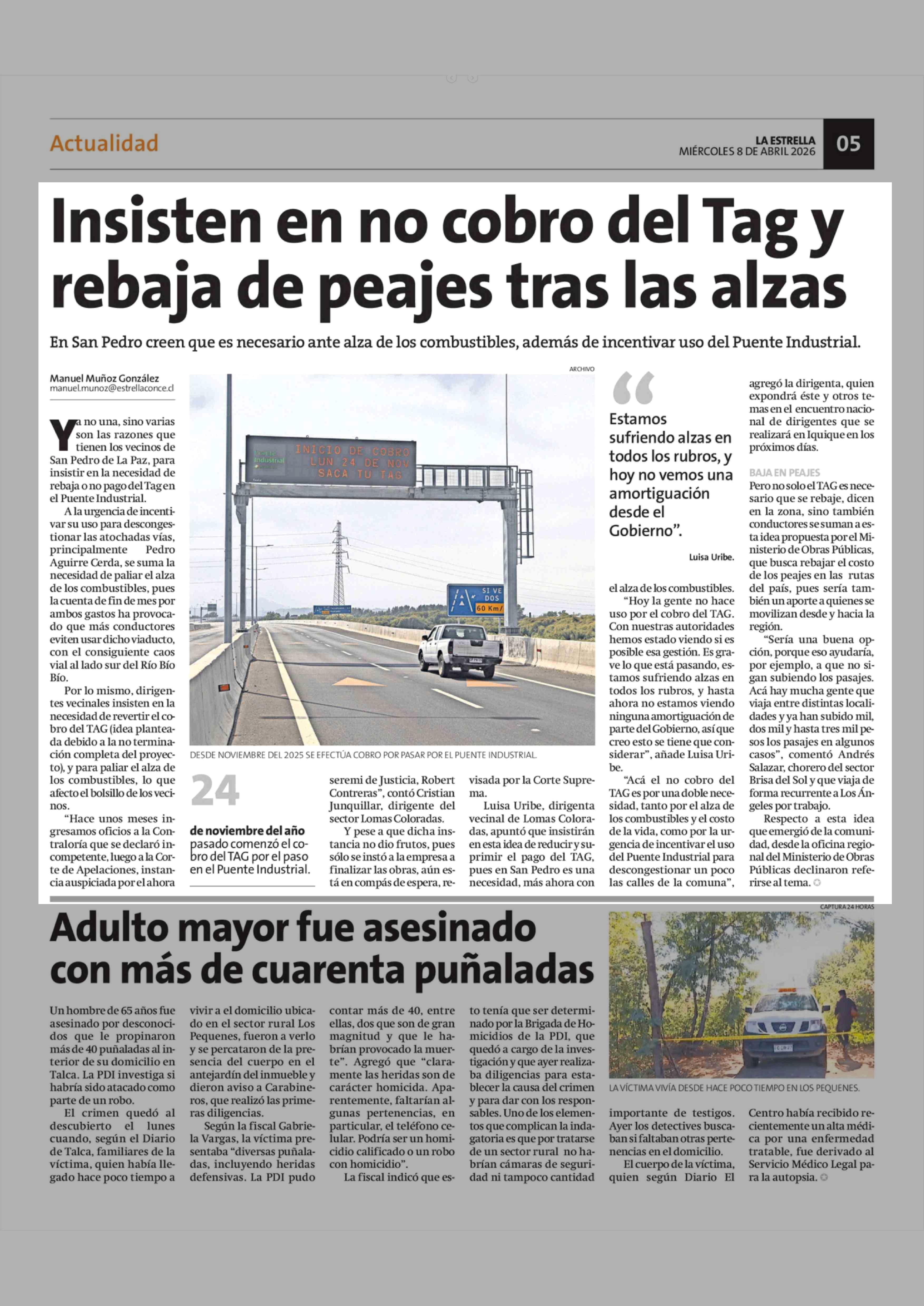 Insisten en no cobro del Tag y rebaja de peajes tras las alzas 08-04-2026 La Estrella de Concepción |