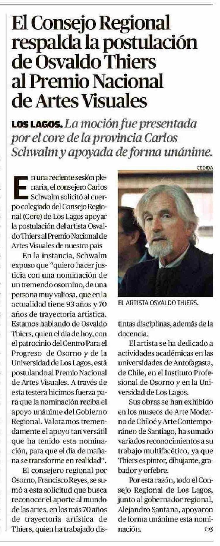 El Consejo Regional de Osvaldo Thiers respalda la postulación de Artes Visuales al Premio Nacional 18-06-2025 El Austral de Osorno |