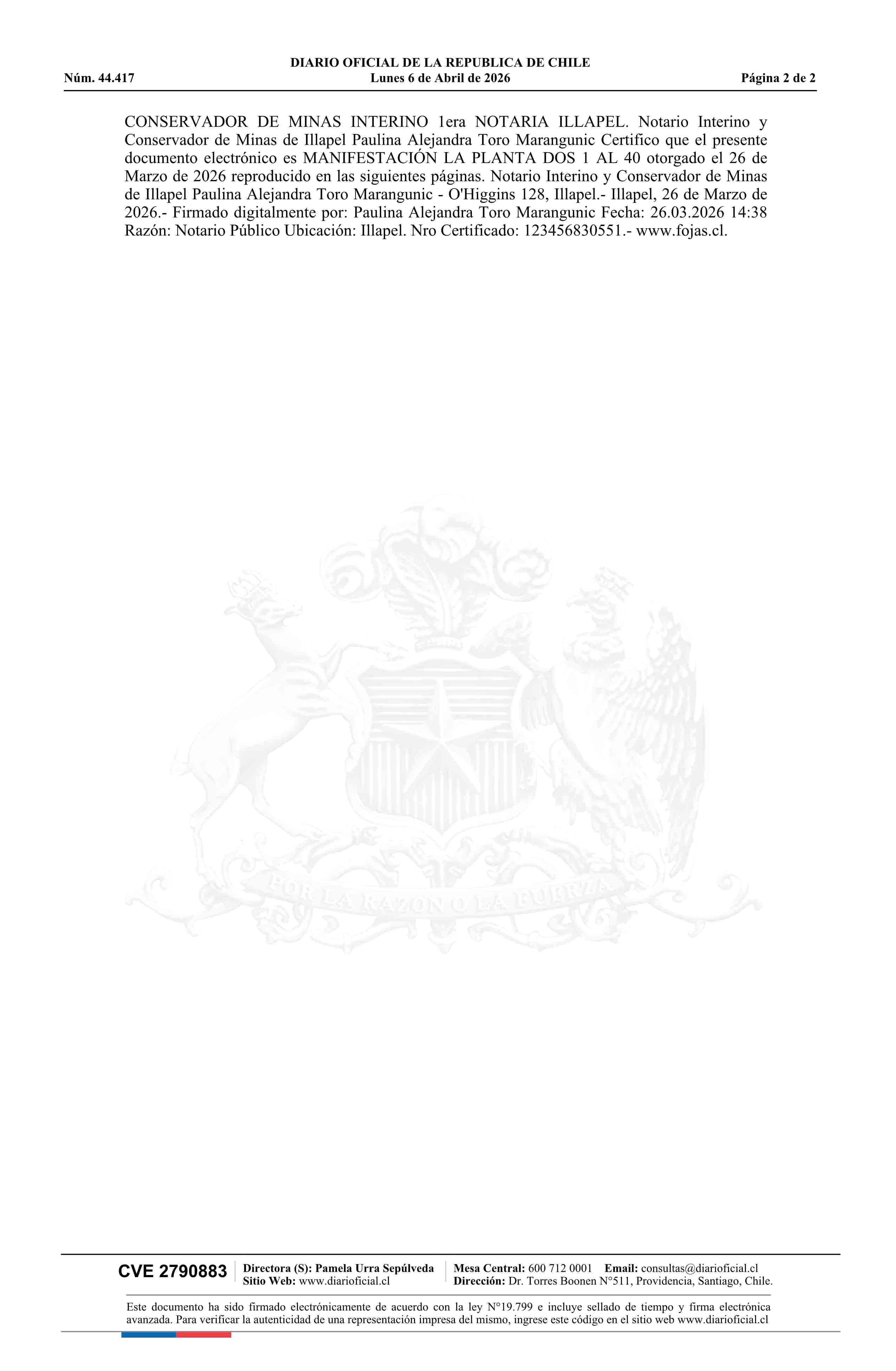 Fuente: DIARIO OFICIAL CHILE - BOLETÍN OFICIAL DE MINERÍA (DIARIO OFICIAL CHILE – BOM – MANIFESTACIONES MIN) Página(s): 38-39