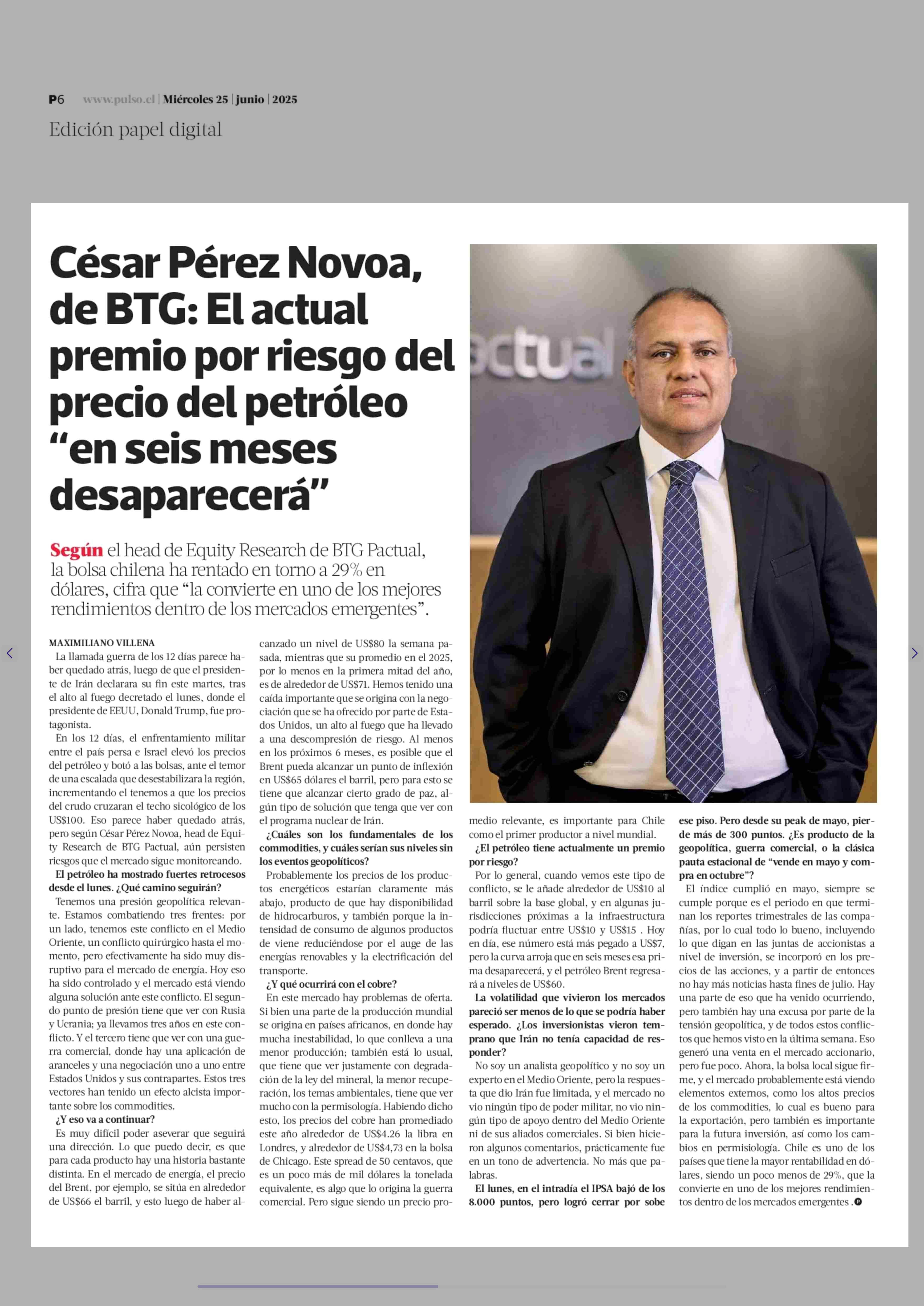 César Pérez Novoa, de BTG: El actual premio por riesgo del precio del petróleo “en seis meses desaparecerá” 25-06-2025 La Tercera |
