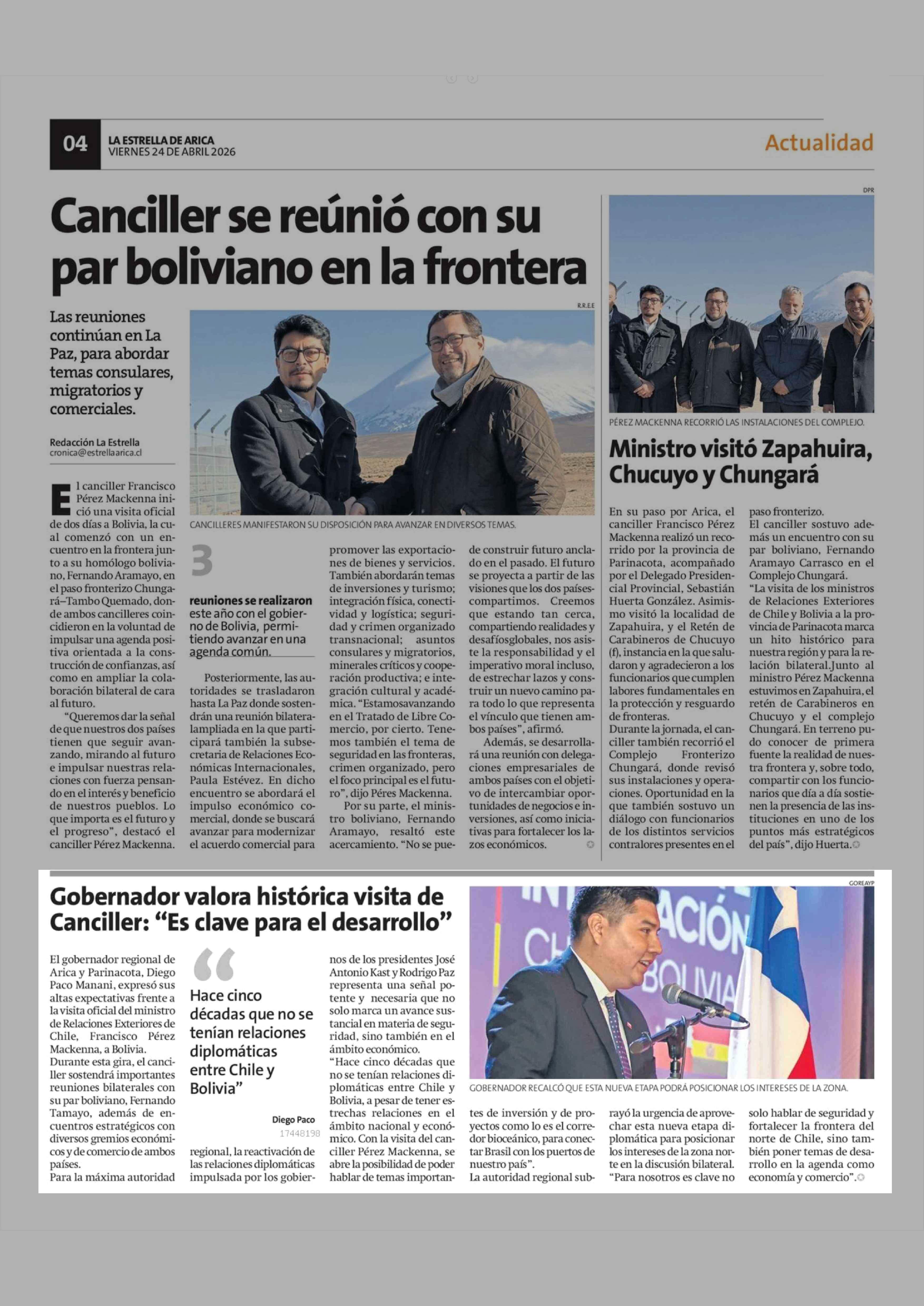 Gobernador valora histórica visita de Canciller: "Es clave para el desarrollo" 24-04-2026 La Estrella de Arica |