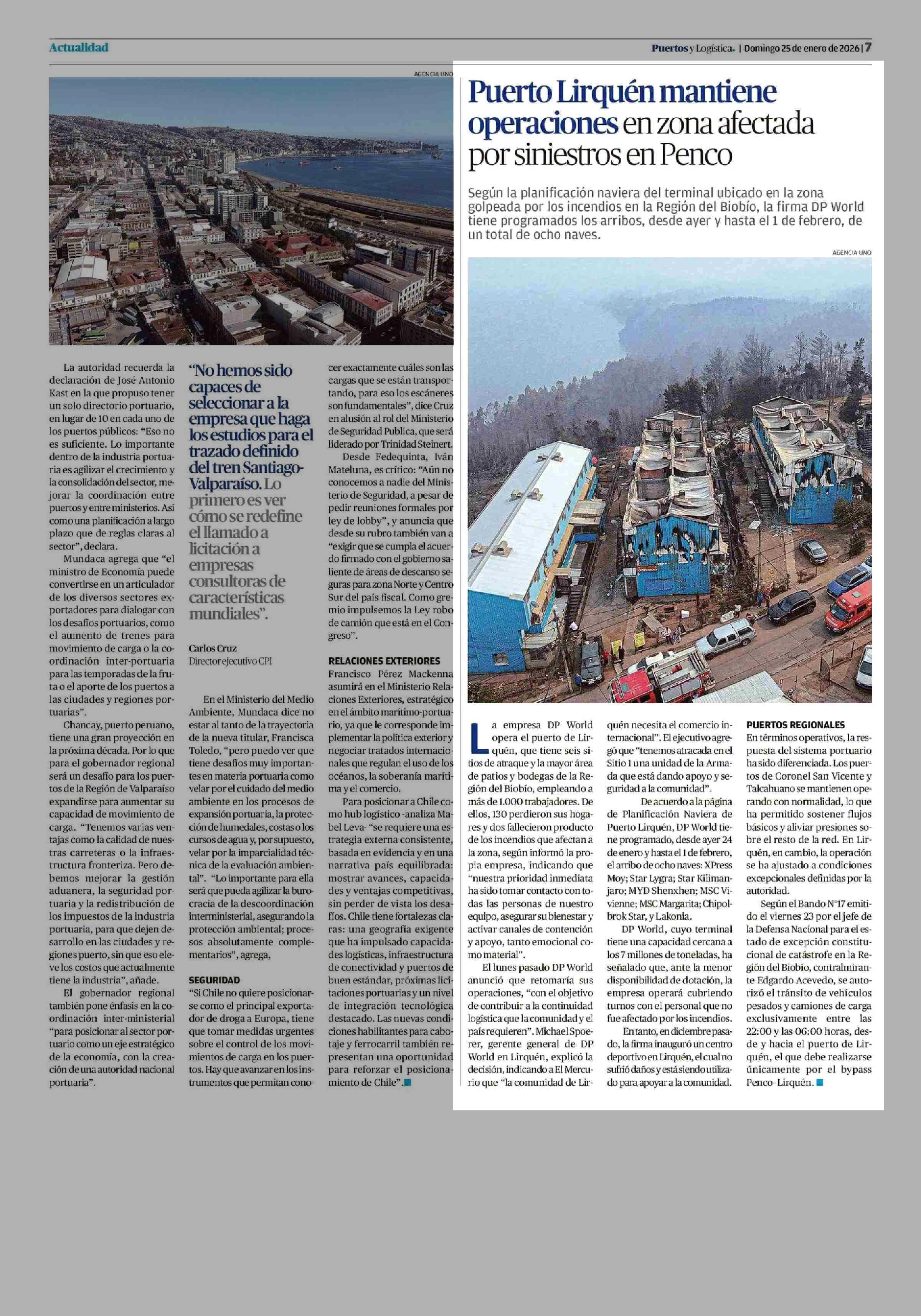 Puerto Lirquén mantiene operaciones en zona afectada por siniestros en Penco 25-01-2026 El Mercurio de Valparaíso |