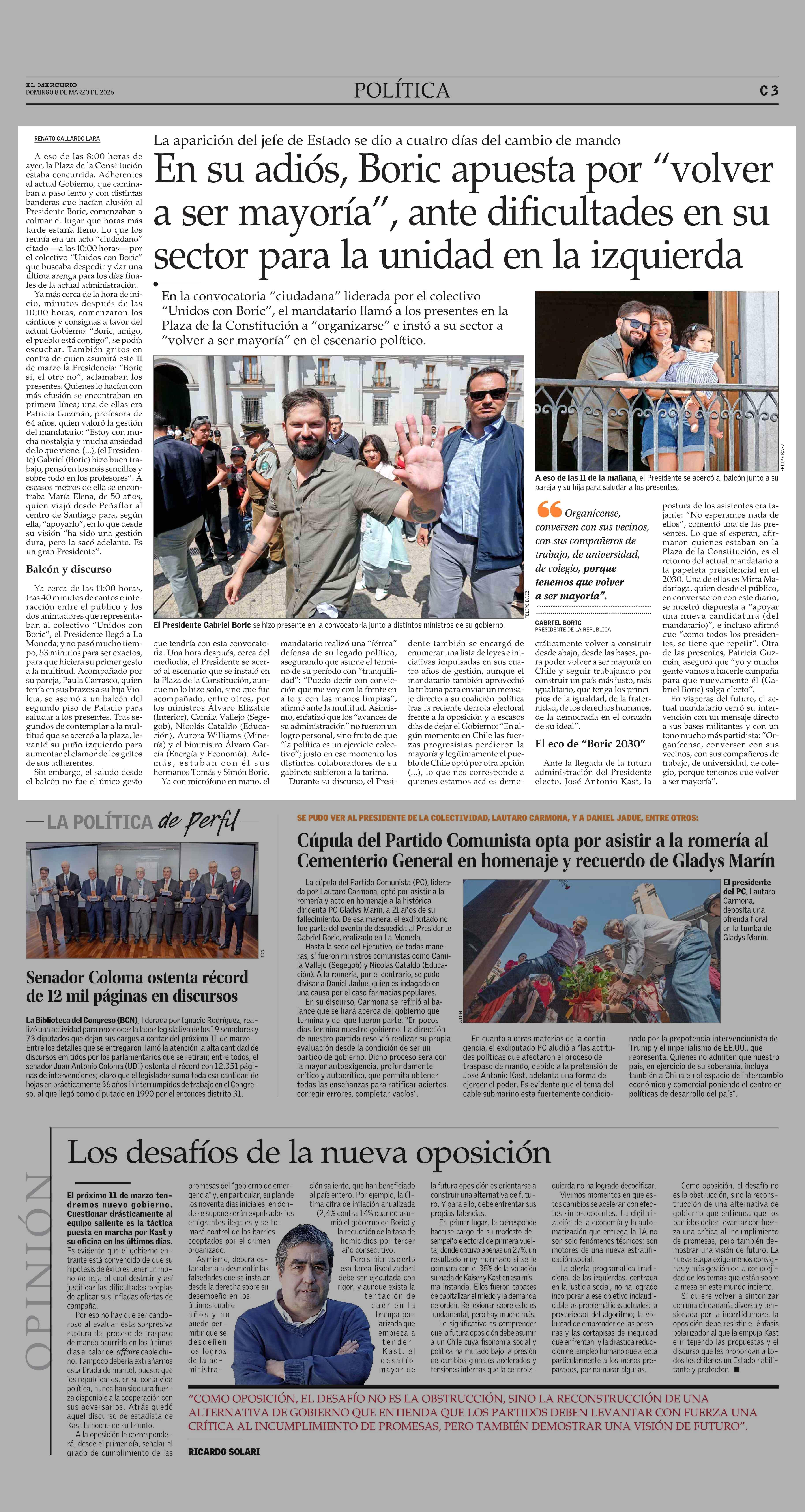 En su adiós, Boric apuesta por “volver a ser mayoría”, ante dificultades en su sector para la unidad en la izquierda 08-03-2026 El Mercurio |