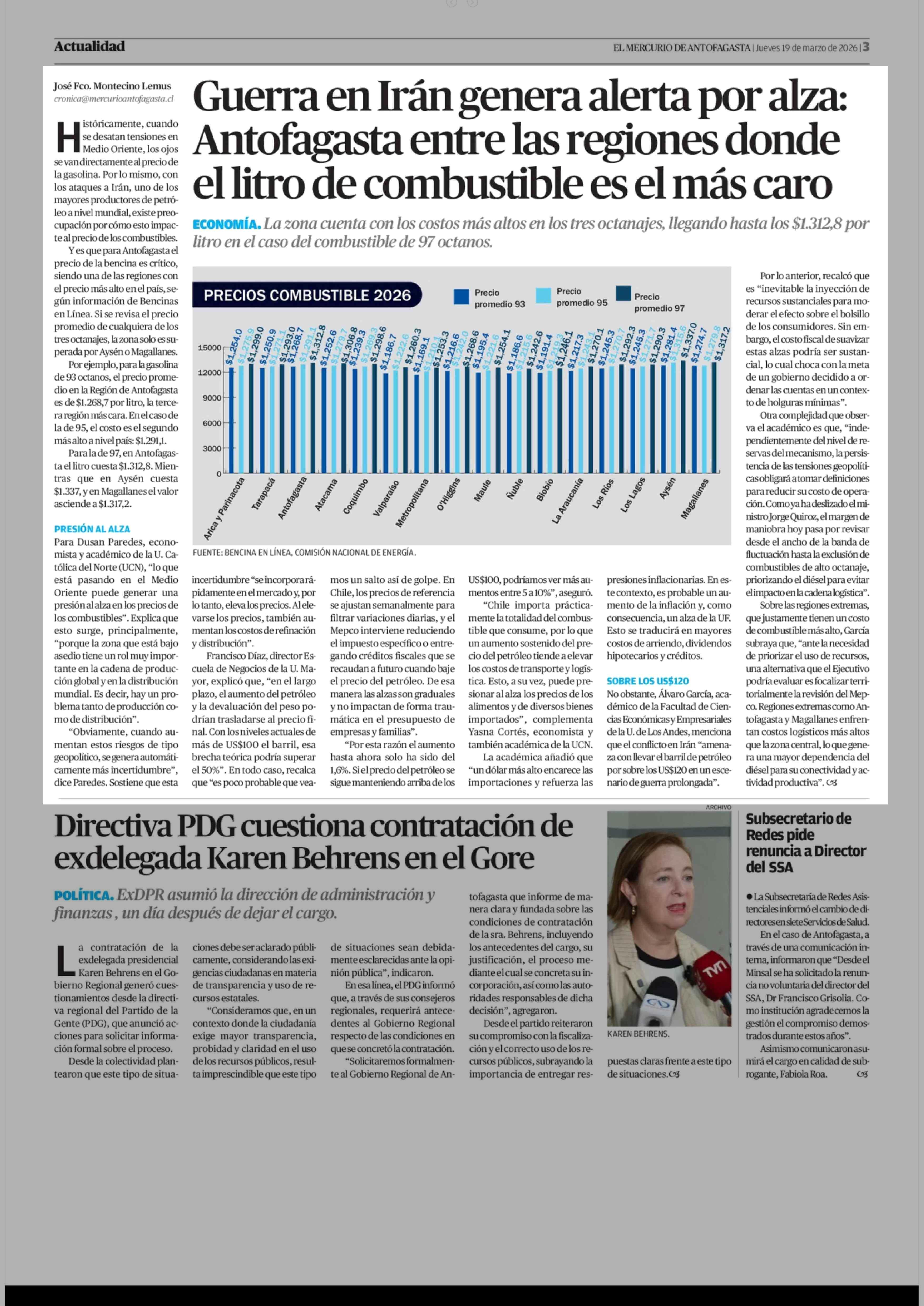 Guerra en Irán genera alerta por alza: Antofagasta entre las regiones donde el litro de combustible es el más caro 19-03-2026 El Mercurio de Antofagasta |