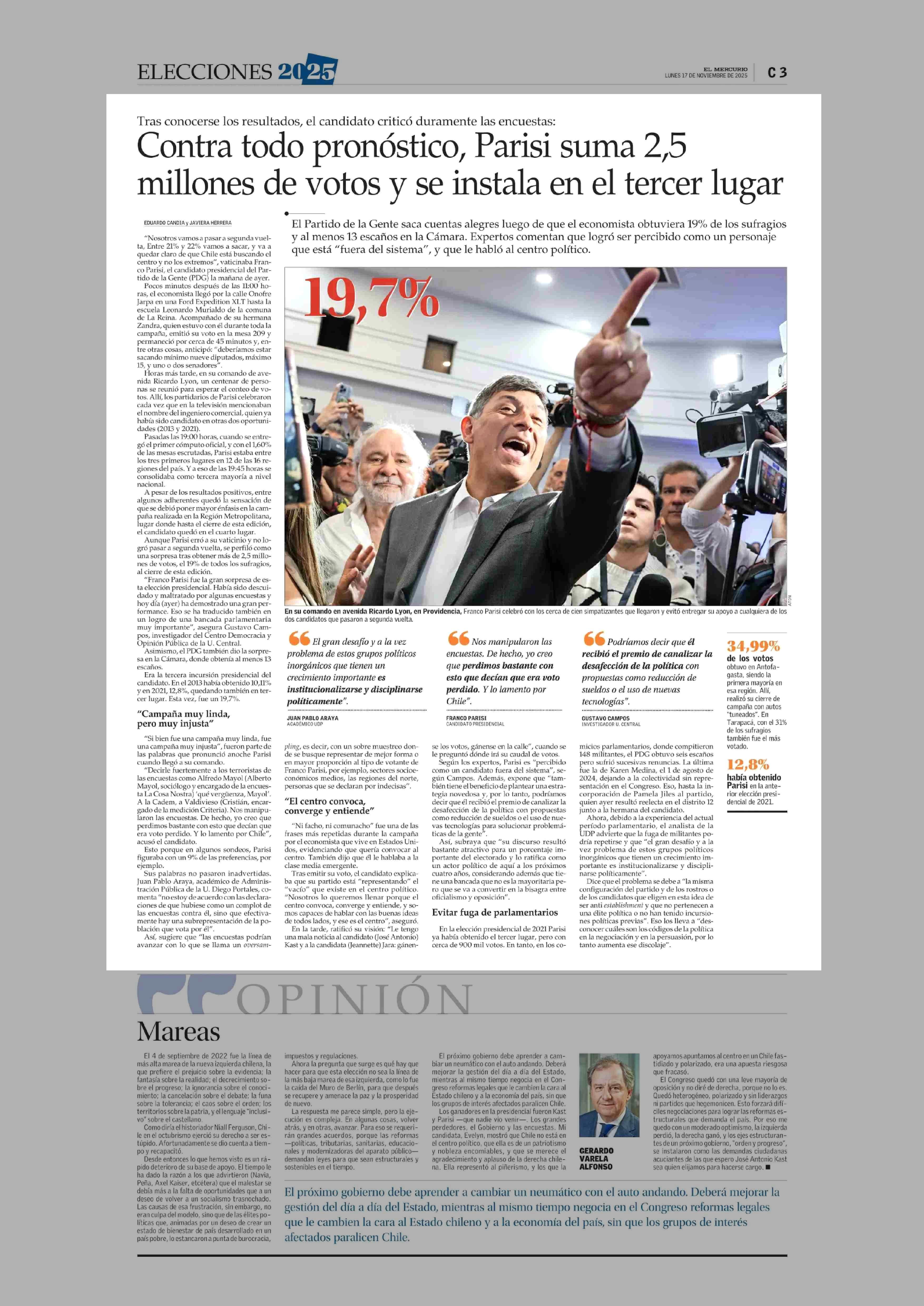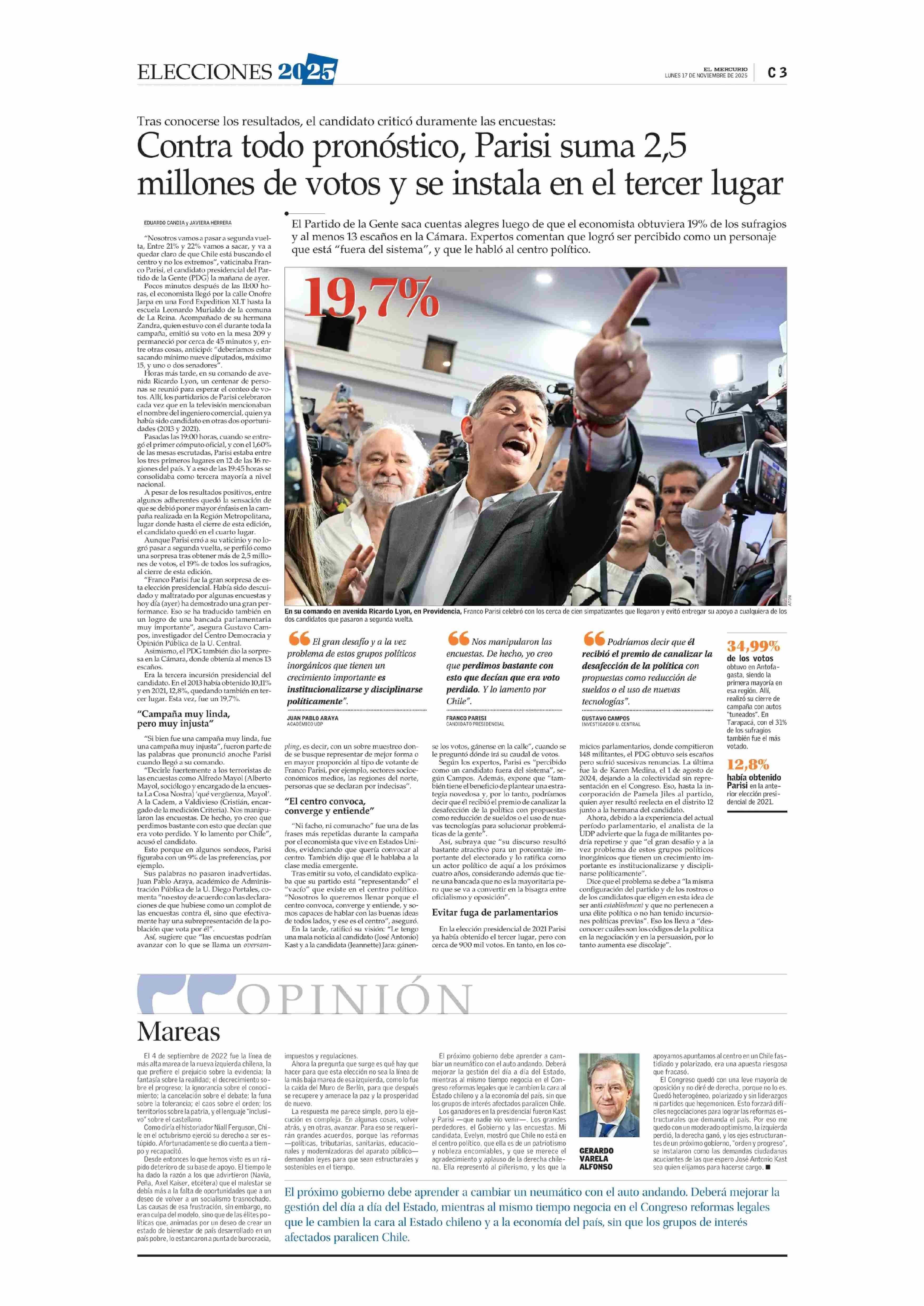 Contra todo pronóstico, Parisi suma 2,5 millones de votos y se instala en el tercer lugar 17-11-2025 El Mercurio |