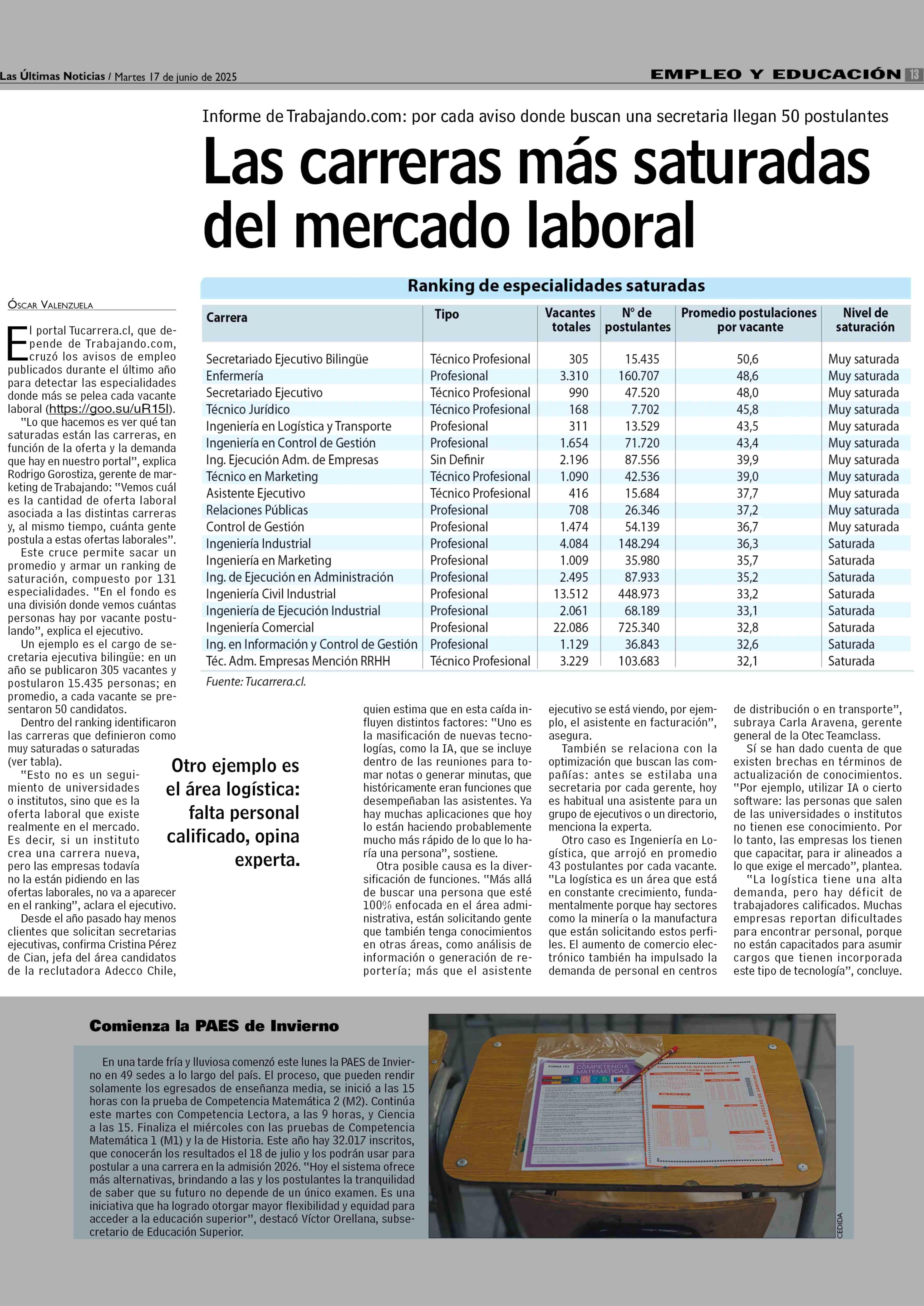 Las carreras más saturadas del mercado laboral 17-06-2025 Las Últimas Noticias |