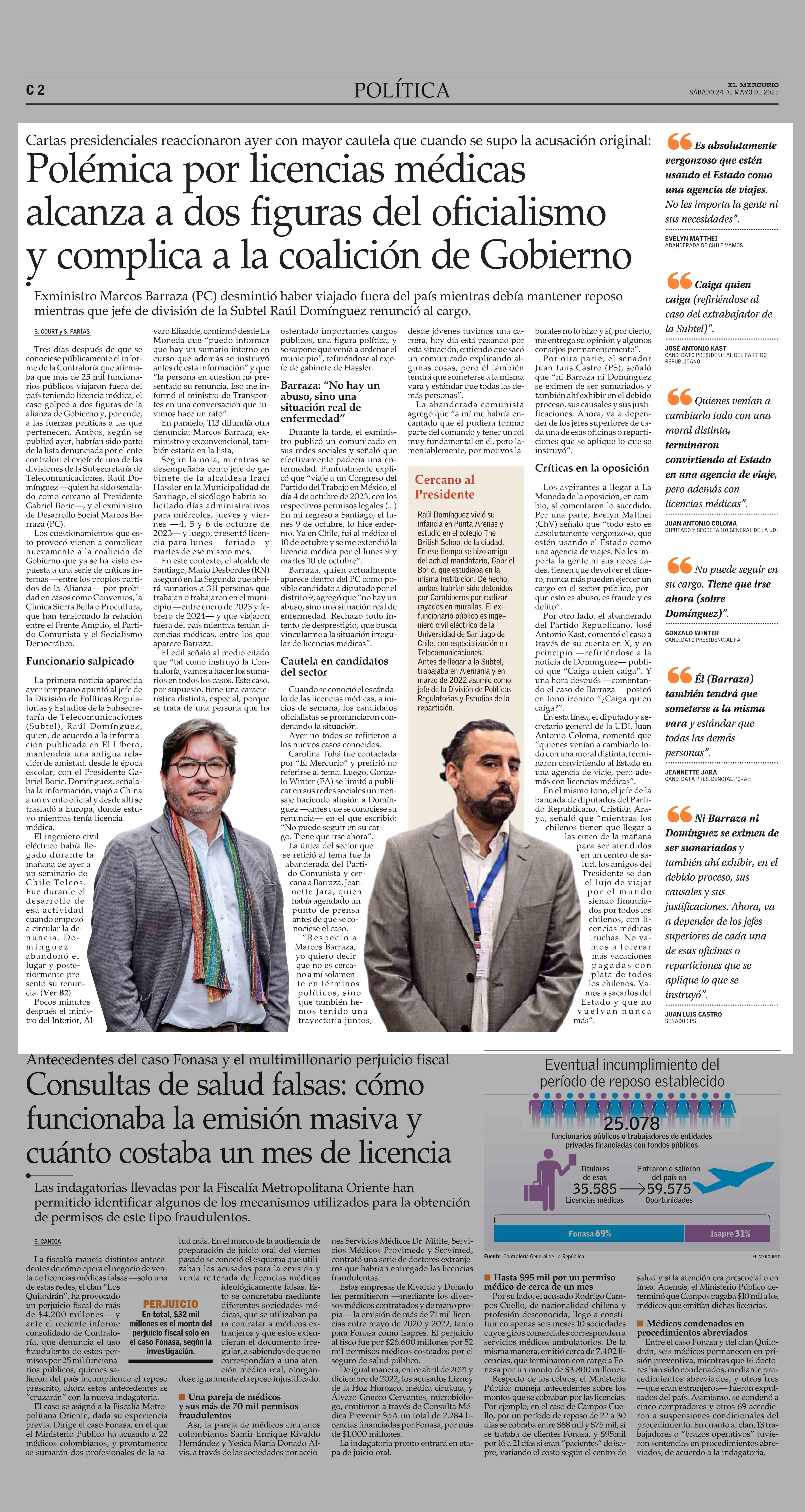 Polémica por licencias médicas alcanza a dos figuras del oficialismo y complica a la coalición de Gobierno 24-05-2025 El Mercurio |