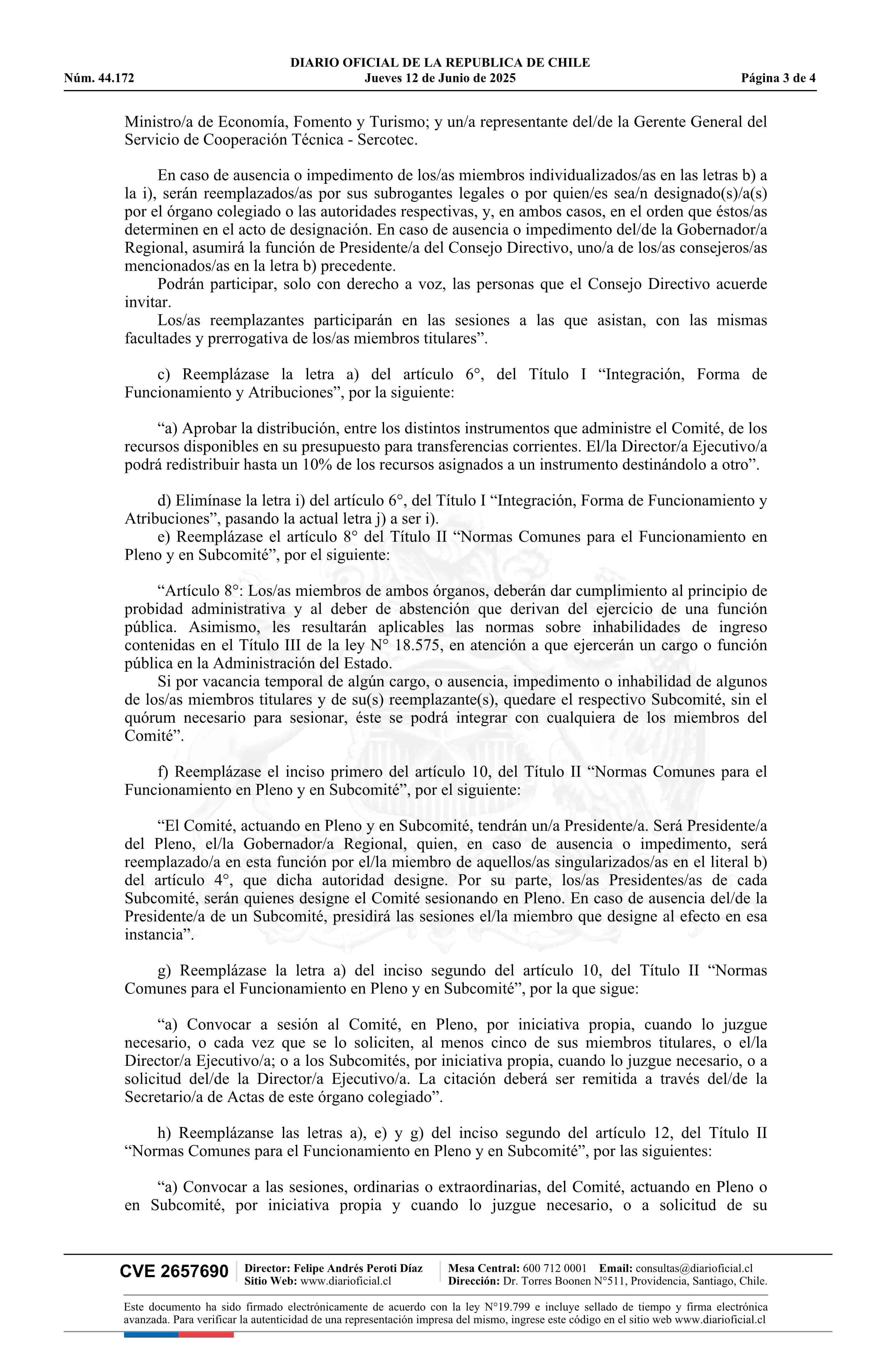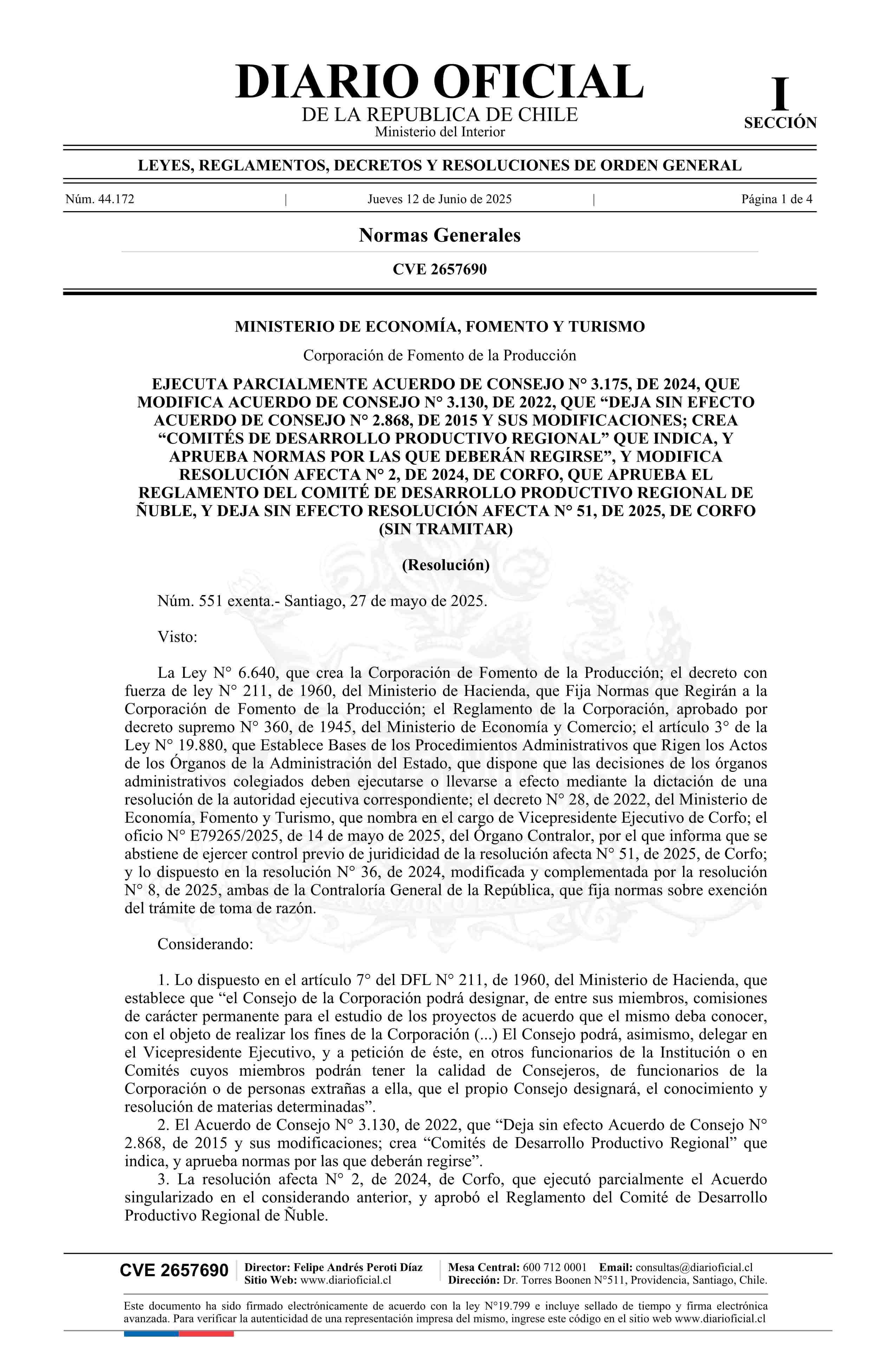 | Título: | Resolución exenta número 551, de 2025.- Ejecuta parcialmente Acuerdo de Consejo N° 3.175, de 2024, que modifica Acuerdo de Consejo N° 3.130, de 2022, que deja sin efecto Acuerdo de Consejo N° 2.868, de 2015, y sus modificaciones; crea Comités de Desarrollo Productivo Regional que indica, y aprueba n |