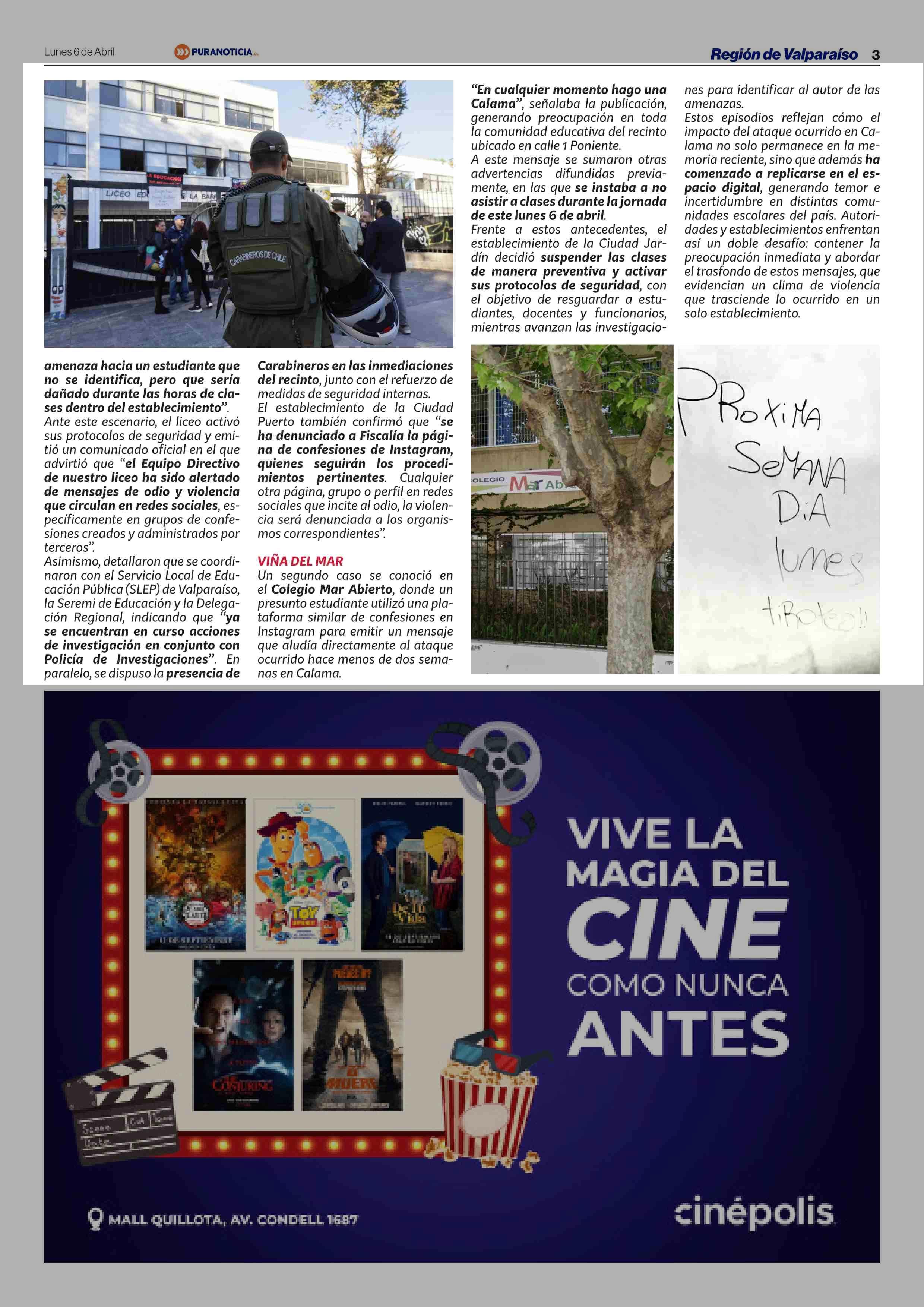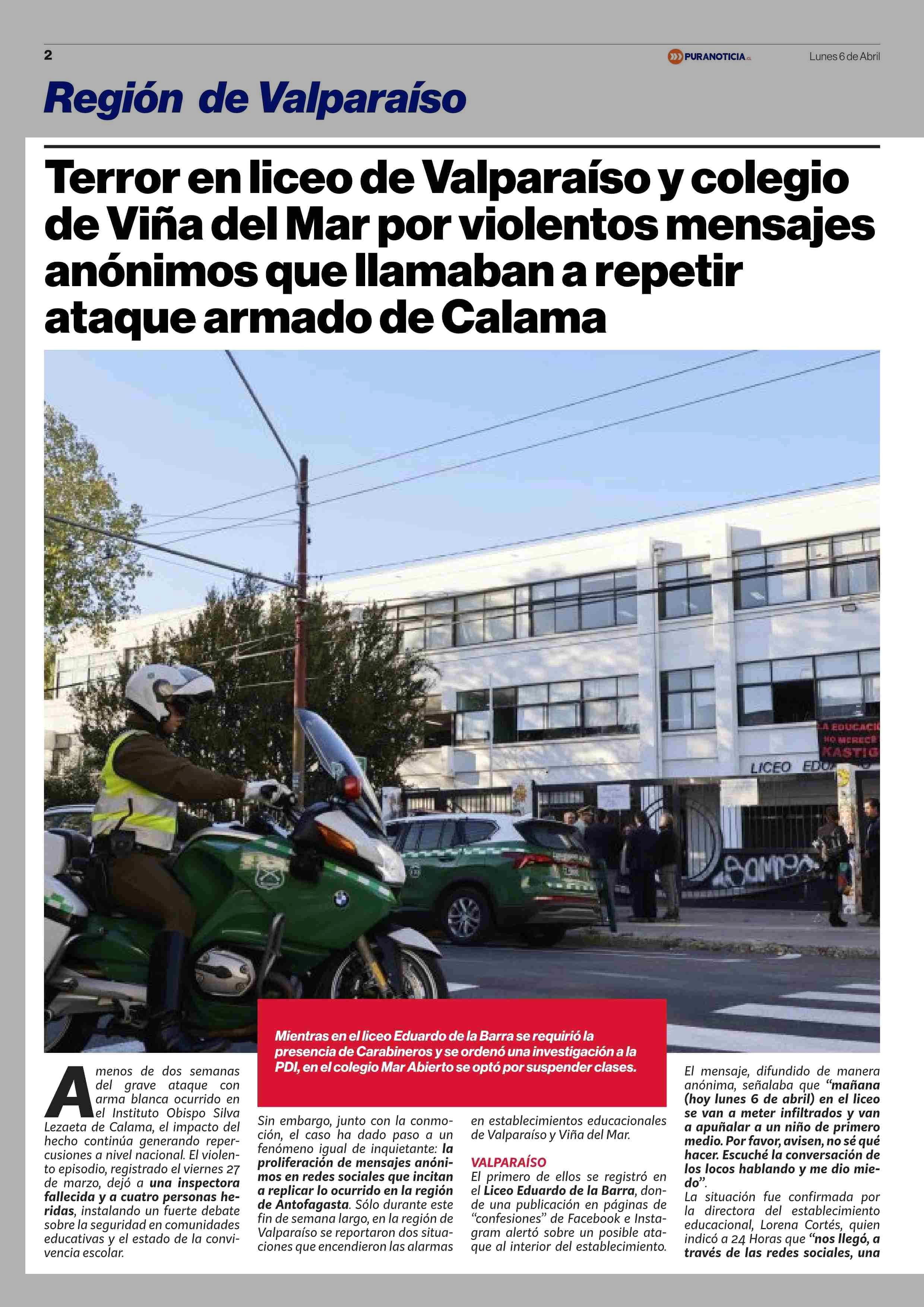 Terror en liceo de Valparaíso y colegio de Viña del Mar por violentos mensajes anónimos que llamaban a repetir ataque armado de Calama 06-04-2026 Puranoticia.cl |