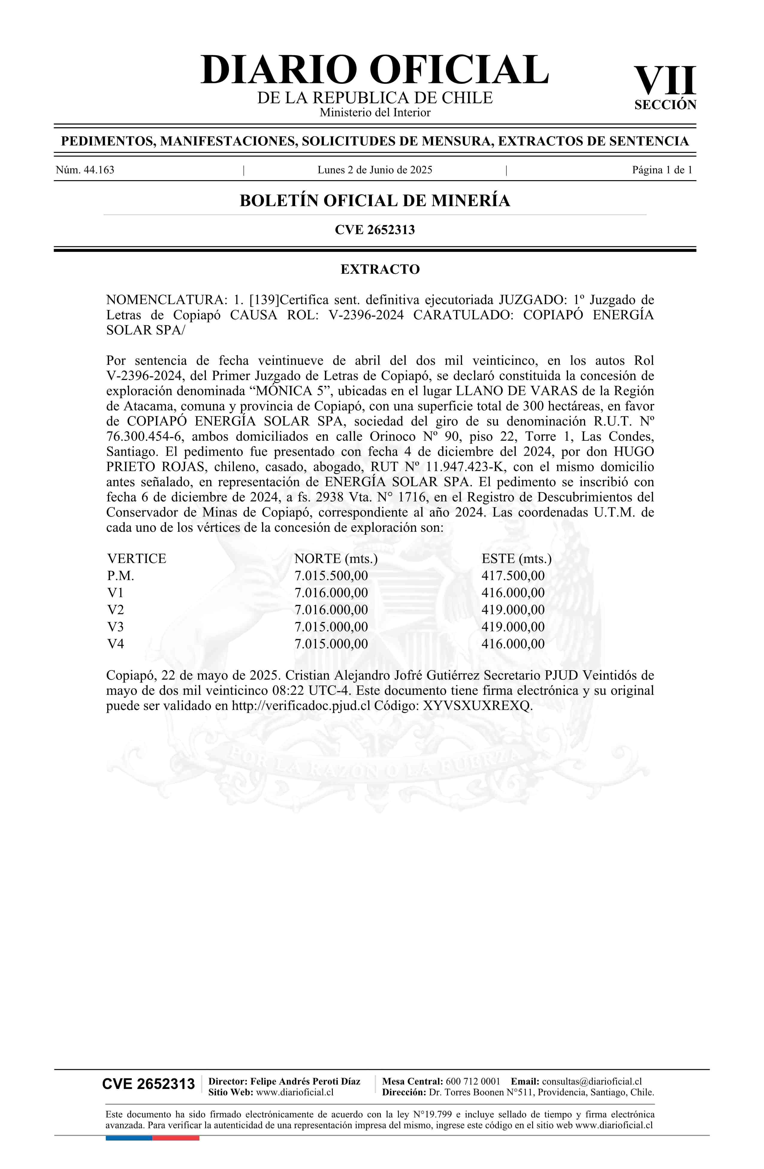 MÓNICA 5 / Copiapó Energía Solar SpA 02-06-2025 DIARIO OFICIAL CHILE - BOLETÍN OFICIAL DE MINERÍA |