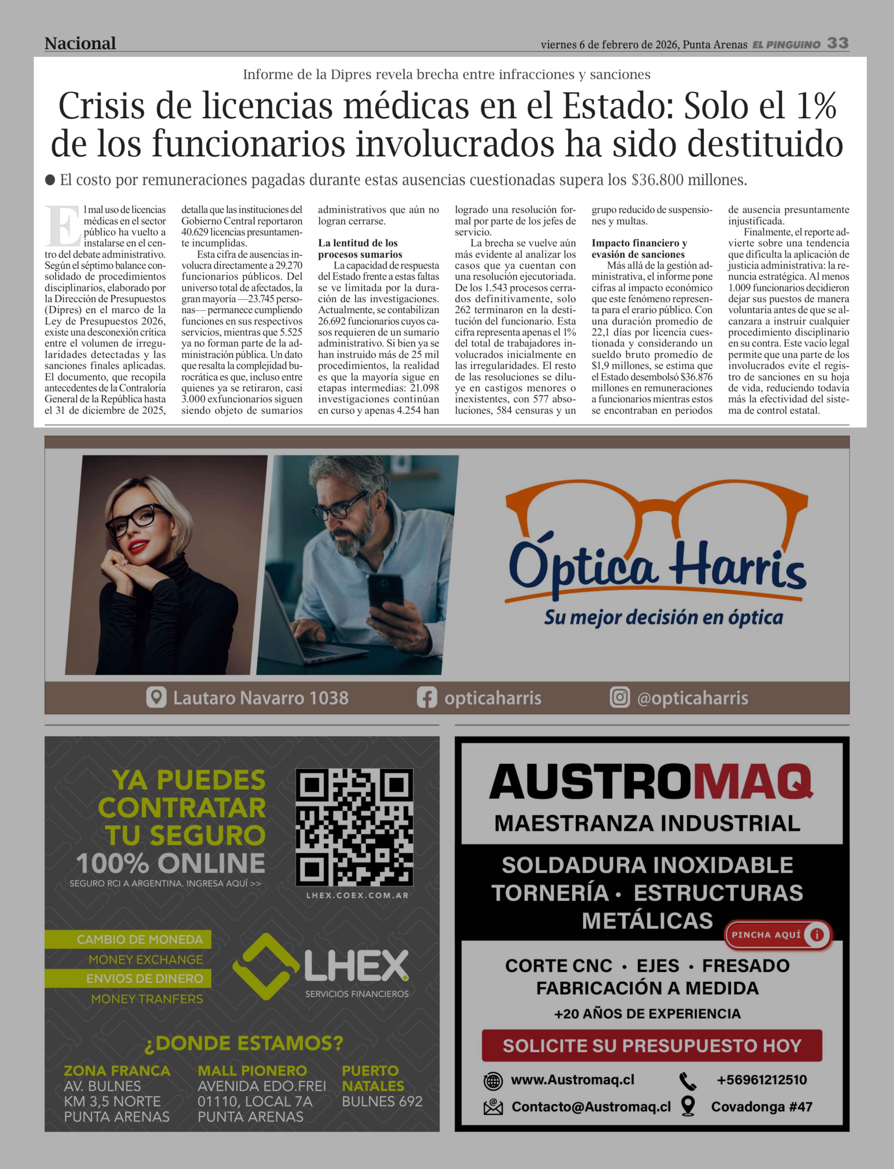 Crisis de licencias médicas en el Estado: Solo el 1% de los funcionarios involucrados ha sido destituido 06-02-2026 El Pingüino |