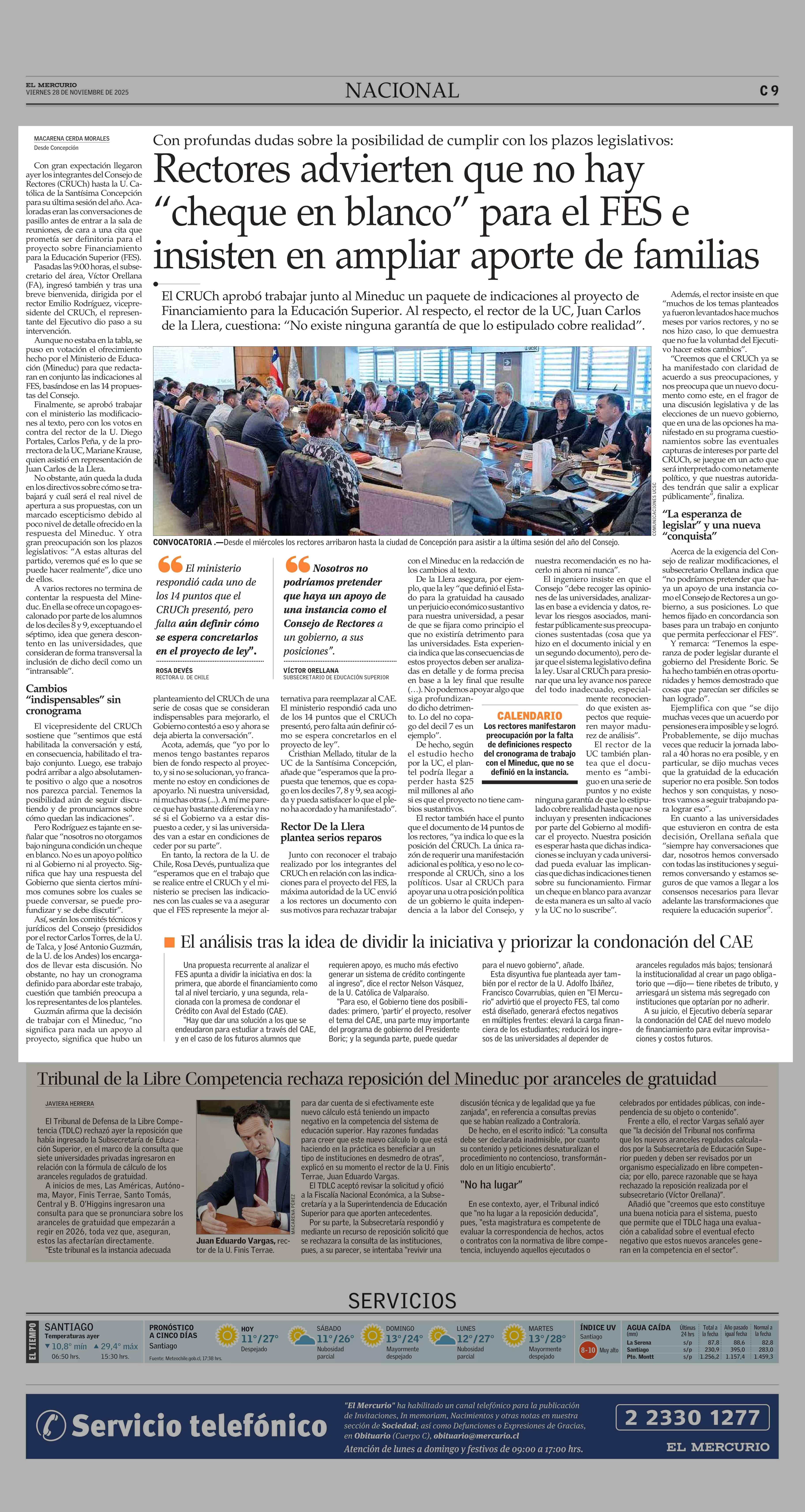 Rectores advierten que no hay “cheque en blanco” para el FES e insisten en ampliar aporte de familias 28-11-2025 El Mercurio |