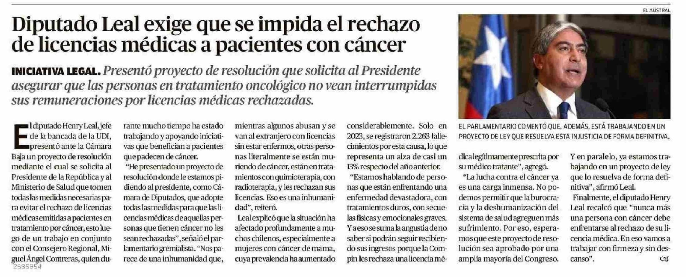Diputado Leal exige que se impida el rechazo de licencias médicas a pacientes con cáncer 17-06-2025 El Austral de la Araucanía |