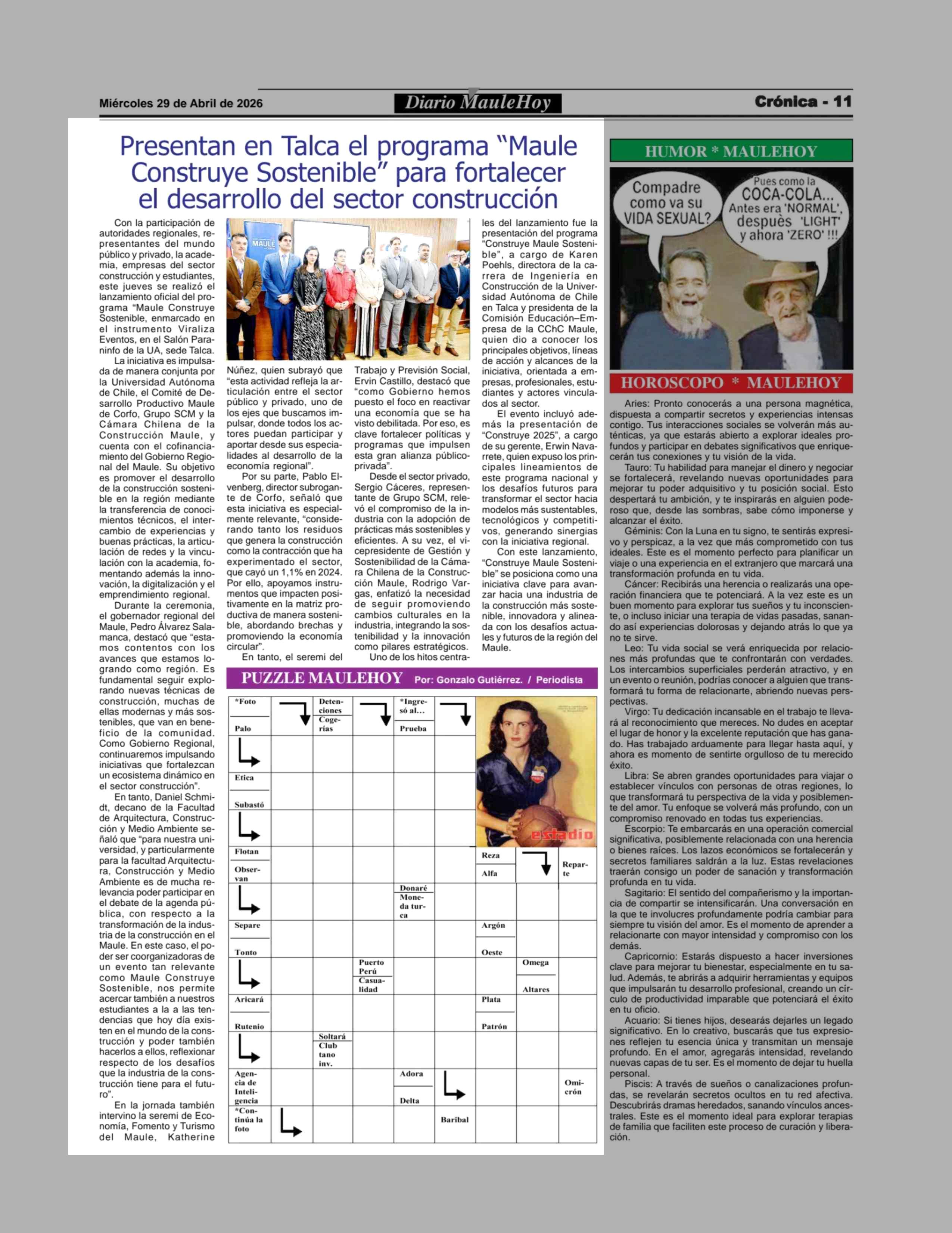 Presentan en Talca el programa “Maule Construye Sostenible” para fortalecer el desarrollo del sector construcción 29-04-2026 Maule Hoy |