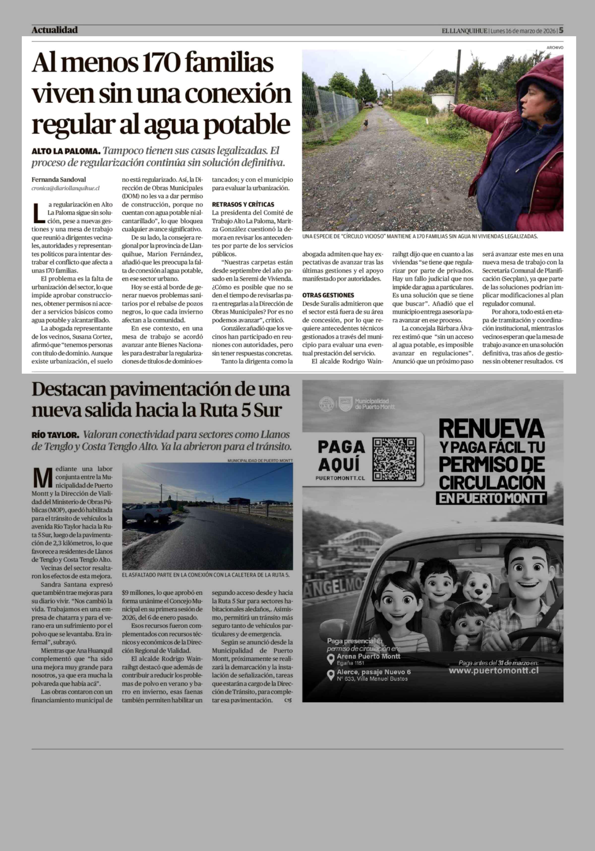 Al menos 170 familias viven sin una conexión regular al agua potable 16-03-2026 El Llanquihue |