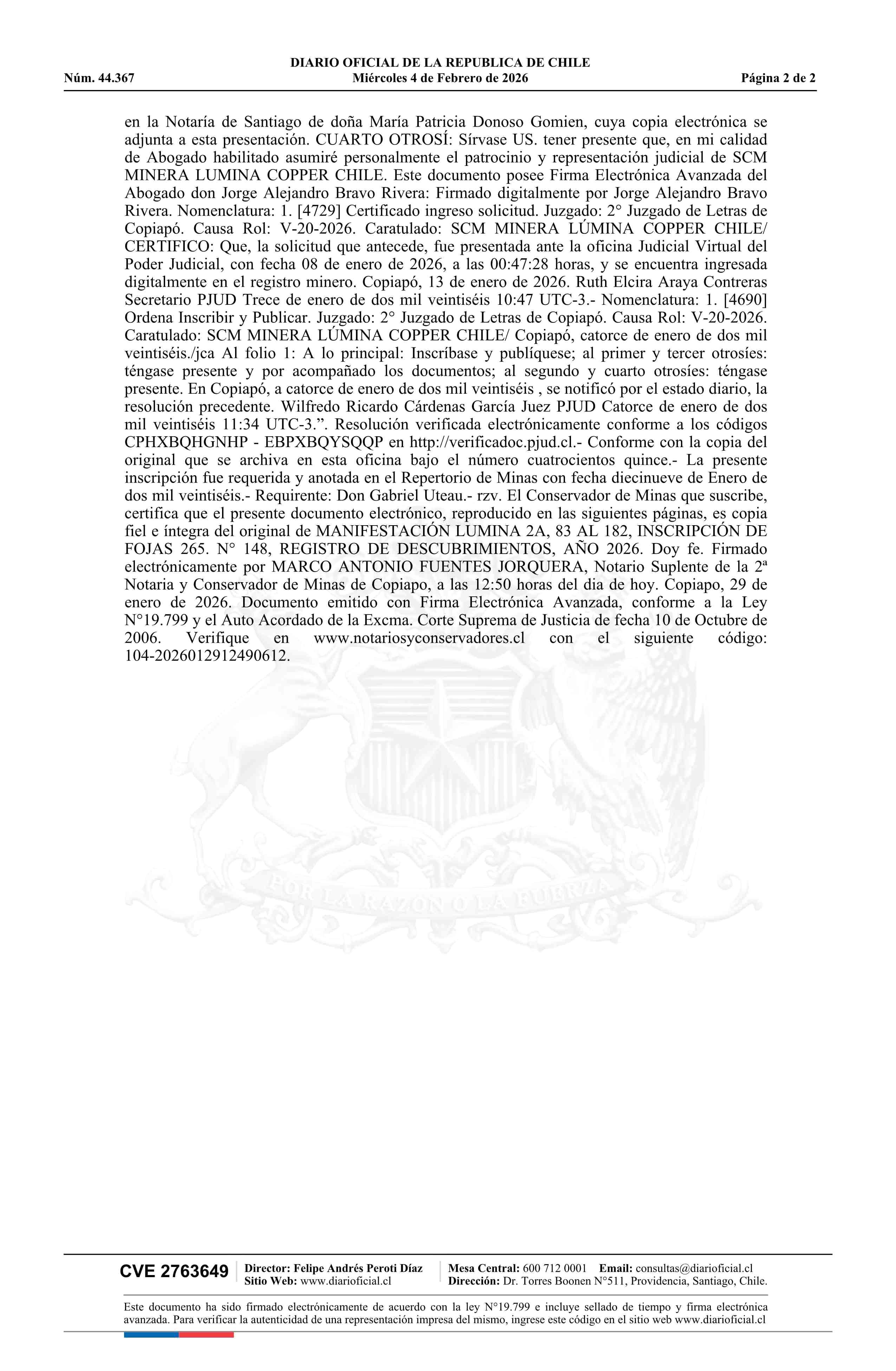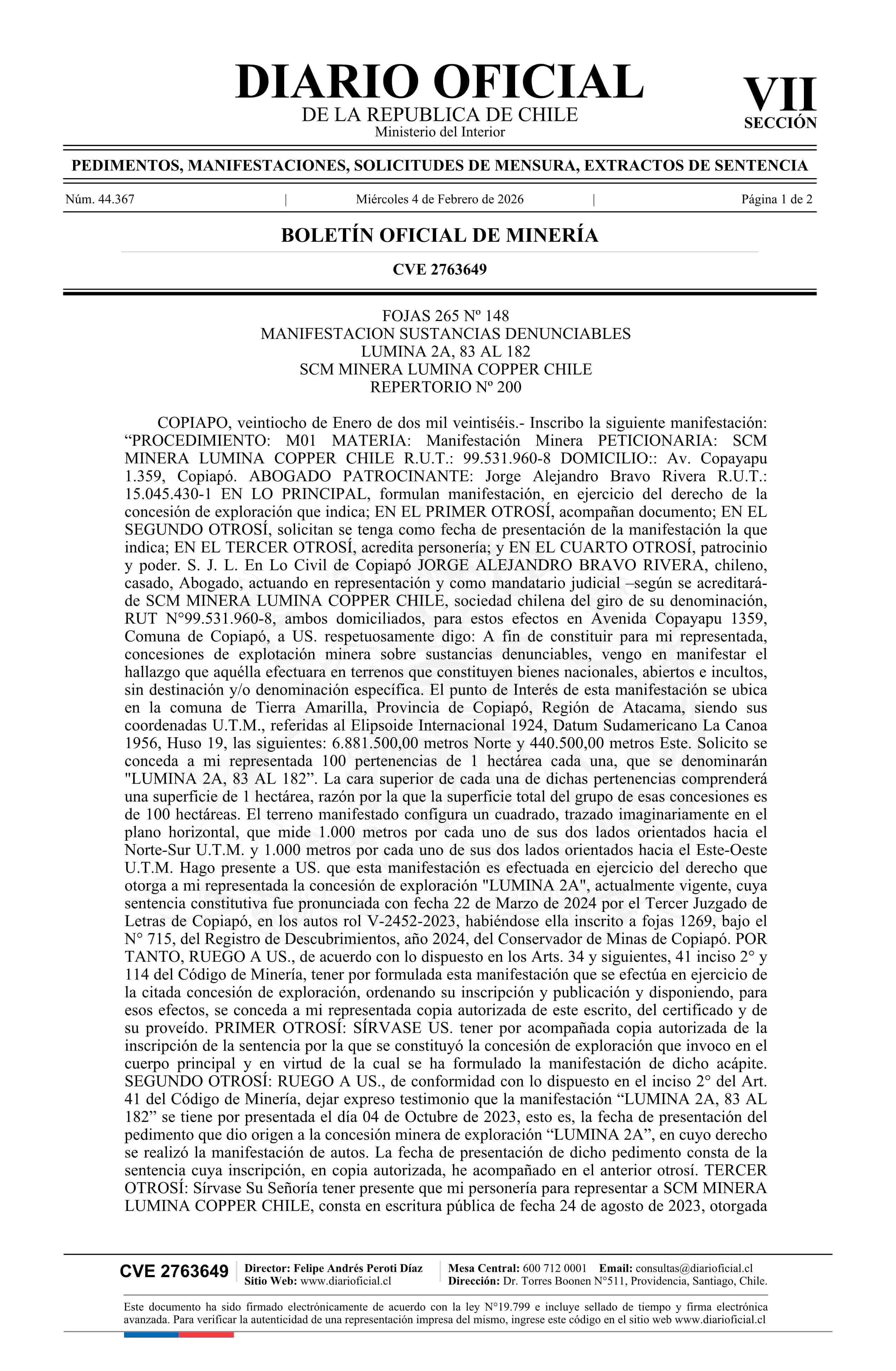 LUMINA 2A, 83 AL 182 / SCM Minera Lumina Copper Chile 04-02-2026 DIARIO OFICIAL CHILE - BOLETÍN OFICIAL DE MINERÍA |
