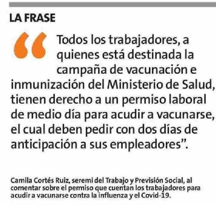 | Título: | LA FRASE 1 Todos los trabajadores, a quienes está destinada la campaña de vacunación e inmunización del Ministerio de Salud, tienen derecho a un permiso laboral de medio día para acudir a vacunarse, el cual deben pedir con dos días de anticipación a sus empleadores”. |