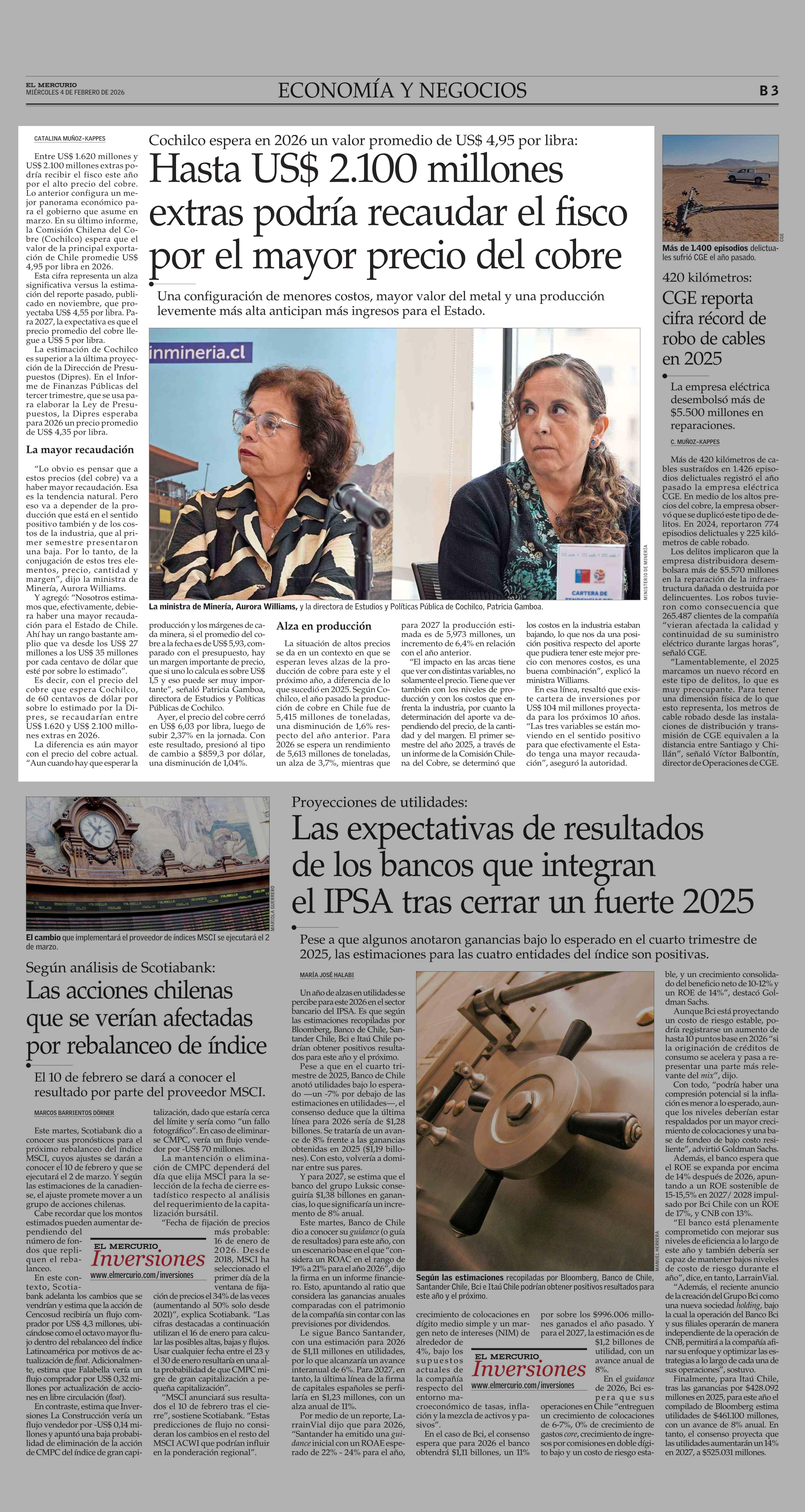 Hasta US$ 2.100 millones extras podría recaudar el fisco por el mayor precio del cobre 04-02-2026 El Mercurio |