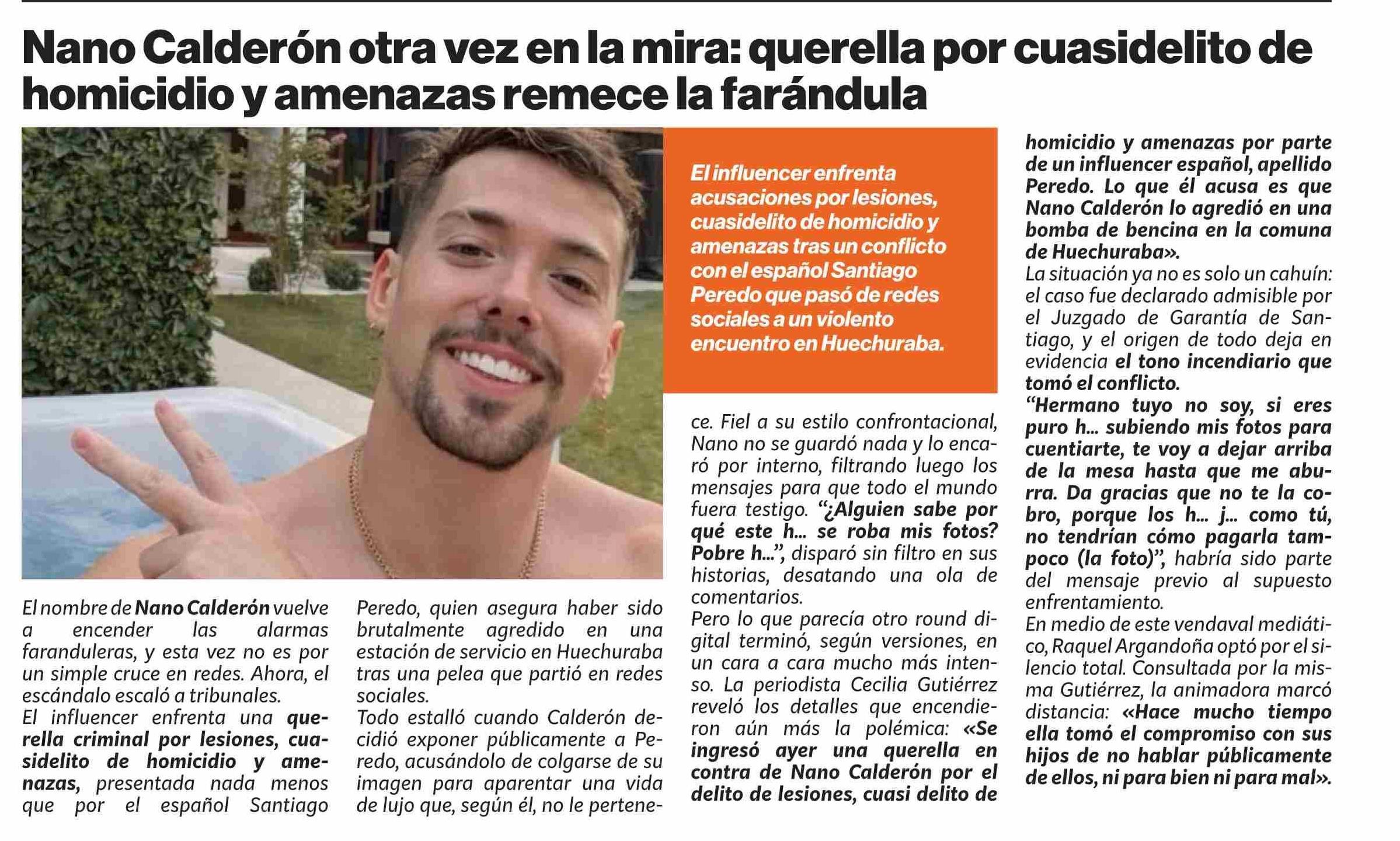 | Título: | Nano Calderón otra vez en la mira: querella por cuasidelito de homicidio y amenazas remece la farándula |