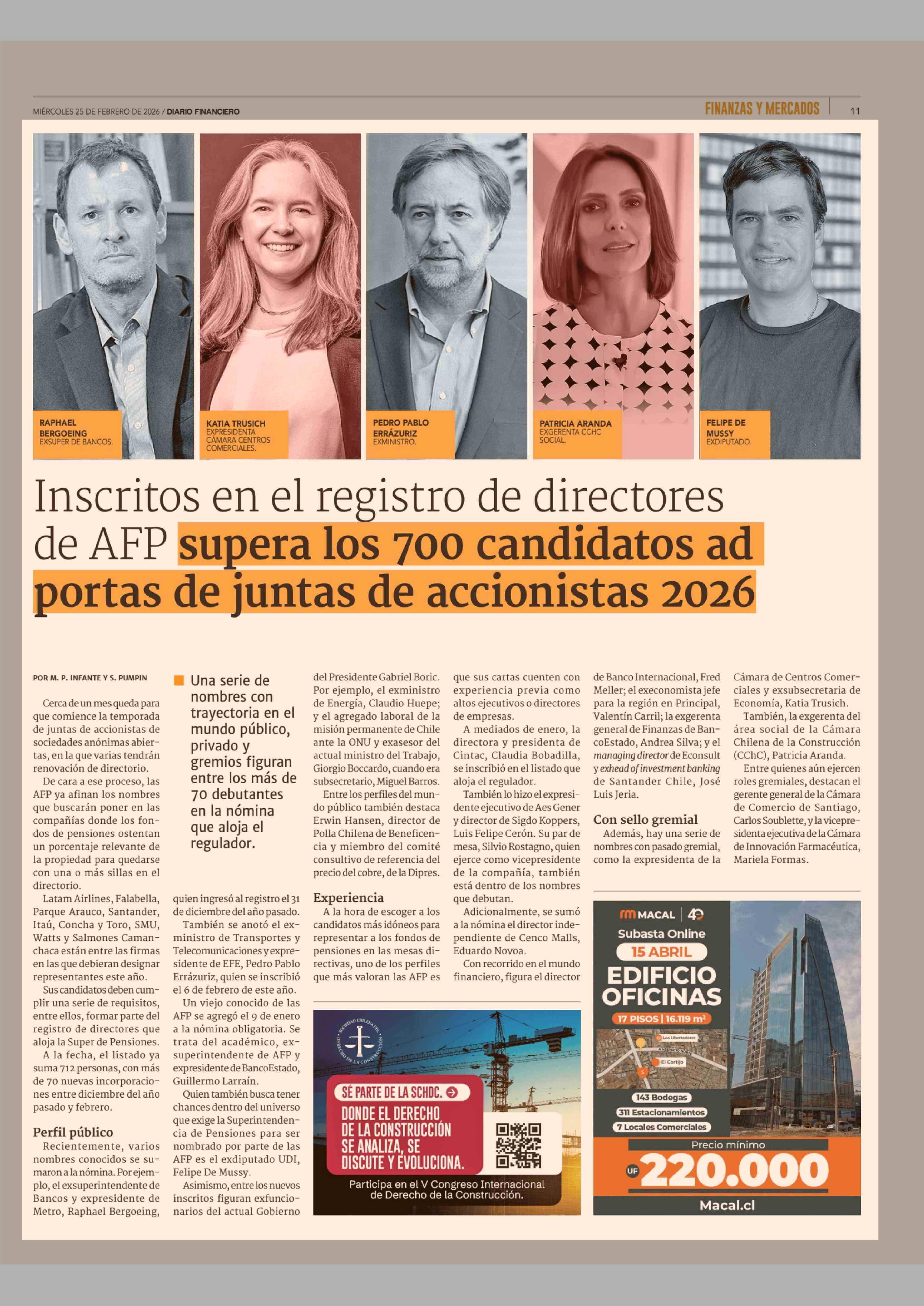 Inscritos en el registro de directores de AFP supera los 700 candidatos ad portas de juntas de accionistas 2026 25-02-2026 Diario Financiero |