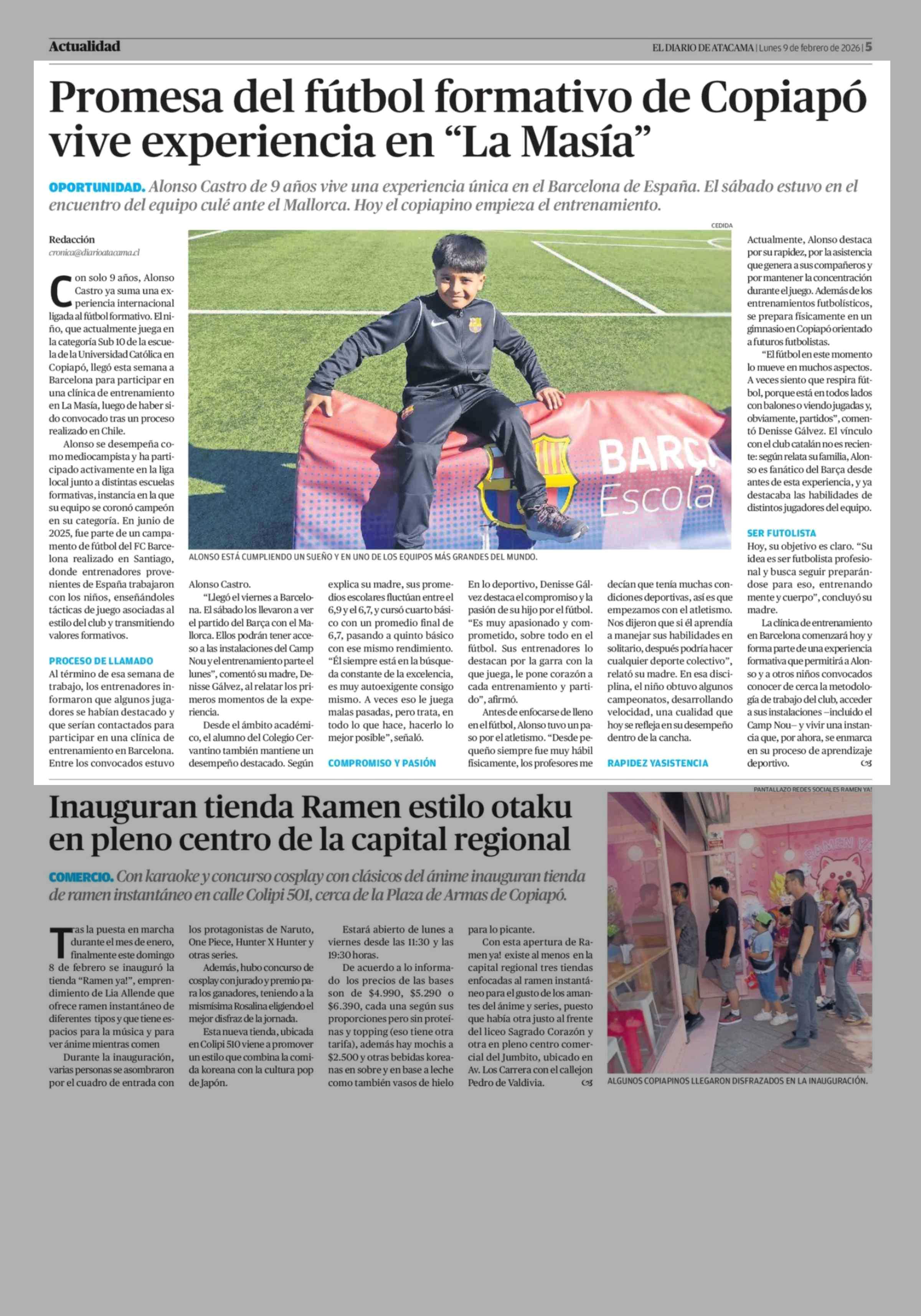 Promesa del fútbol formativo de Copiapó vive experiencia en "La Masía" 09-02-2026 El Diario de Atacama |