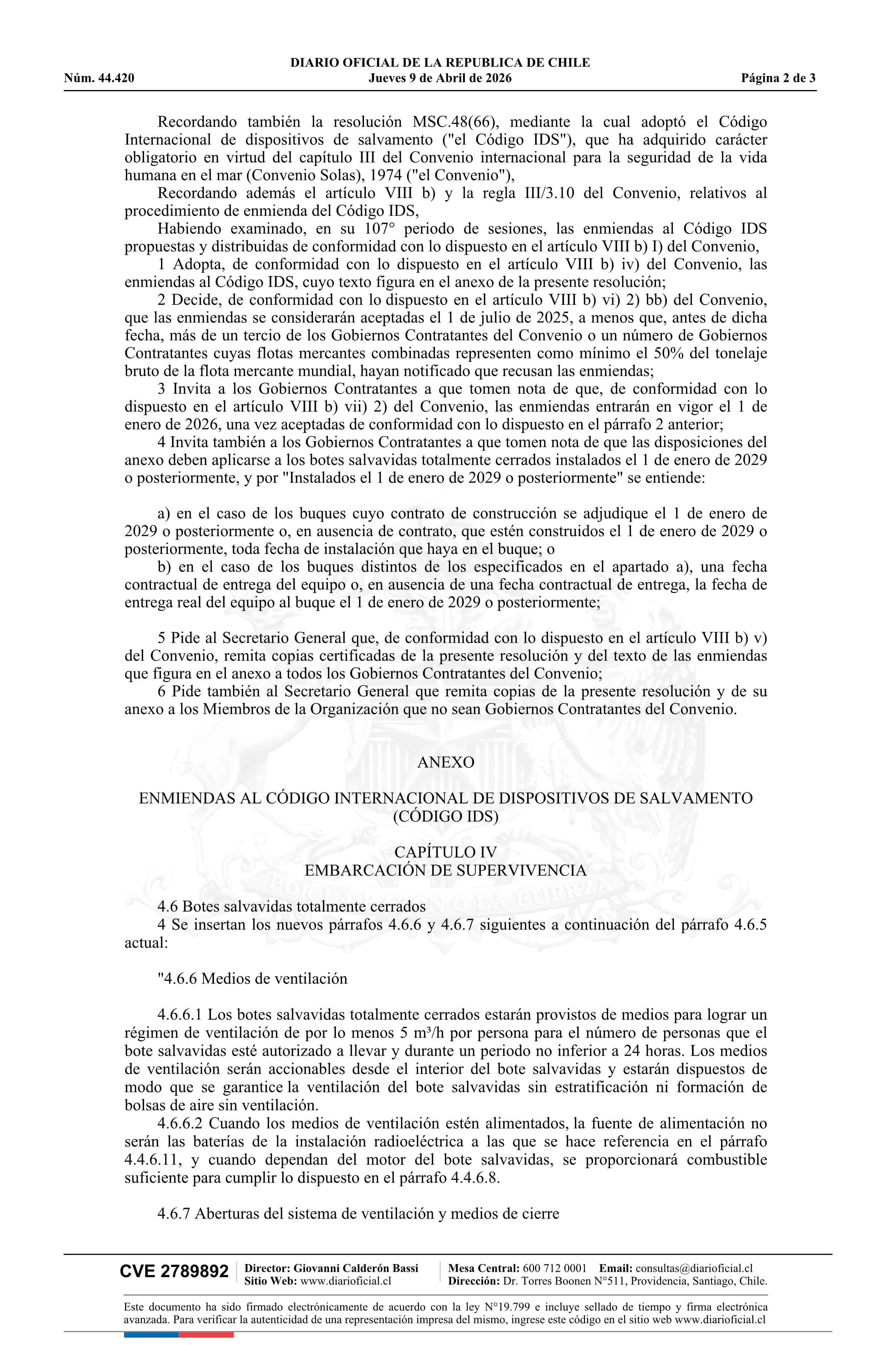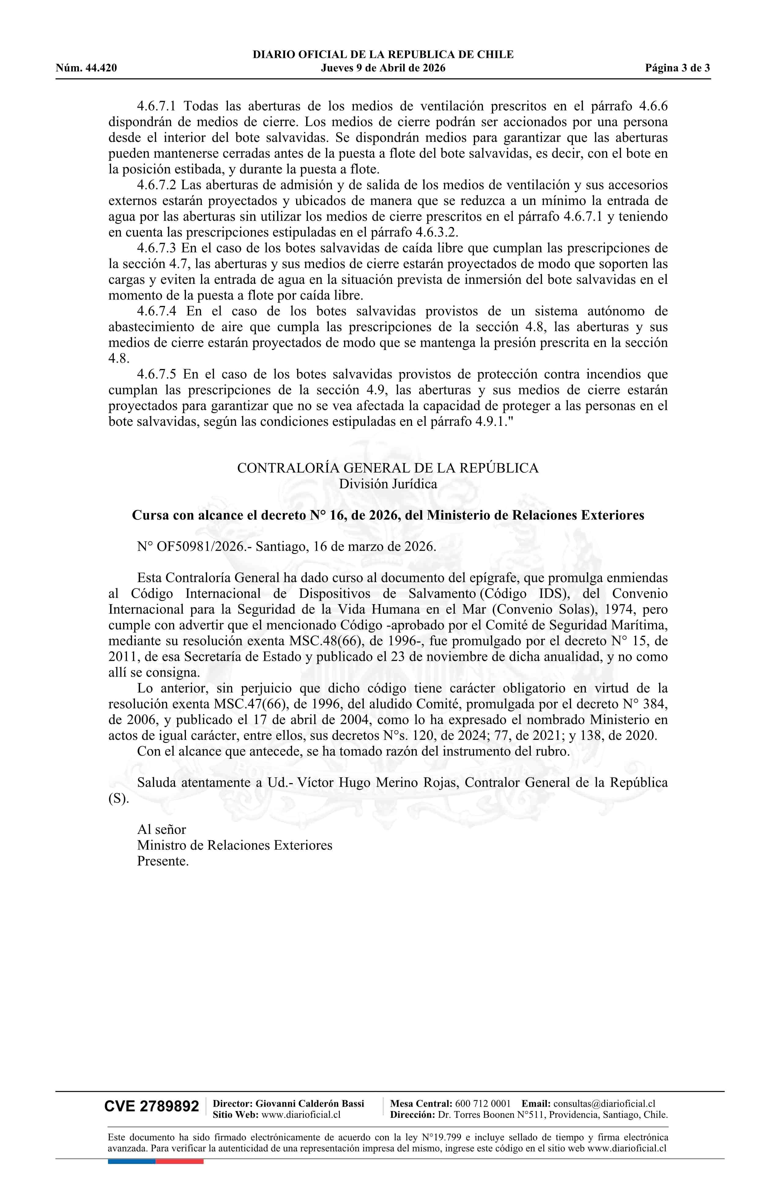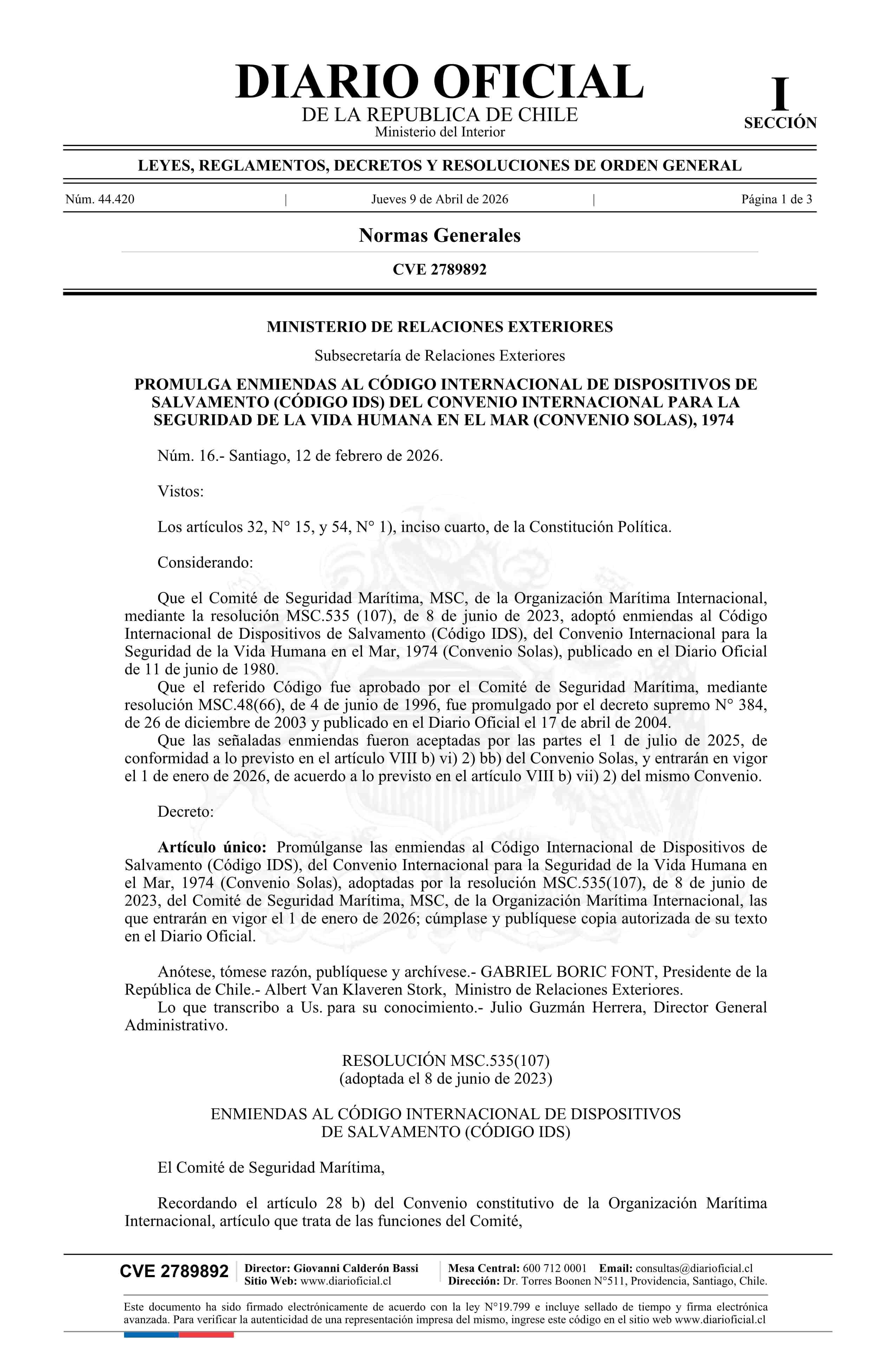 | Título: | Decreto número 16, de 2026.- Promulga Enmiendas al Código Internacional de Dispositivos de Salvamento (Código IDS) del Convenio Internacional para la Seguridad de la Vida Humana en el Mar (Convenio Solas), 1974 |