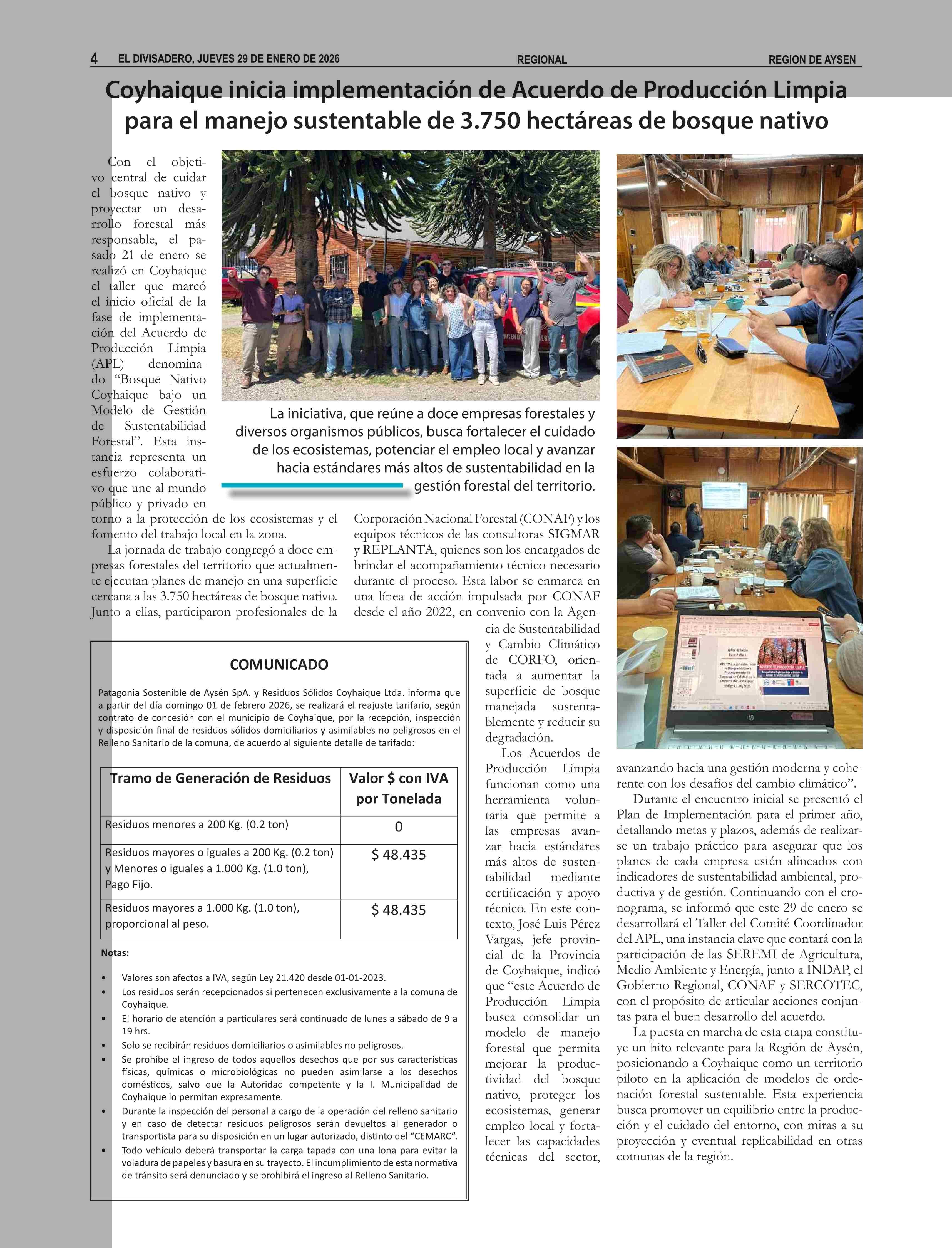 Coyhaique inicia implementación de Acuerdo de Producción Limpia para el manejo sustentable de 3.750 hectáreas de bosque nativo 29-01-2026 El Divisadero |