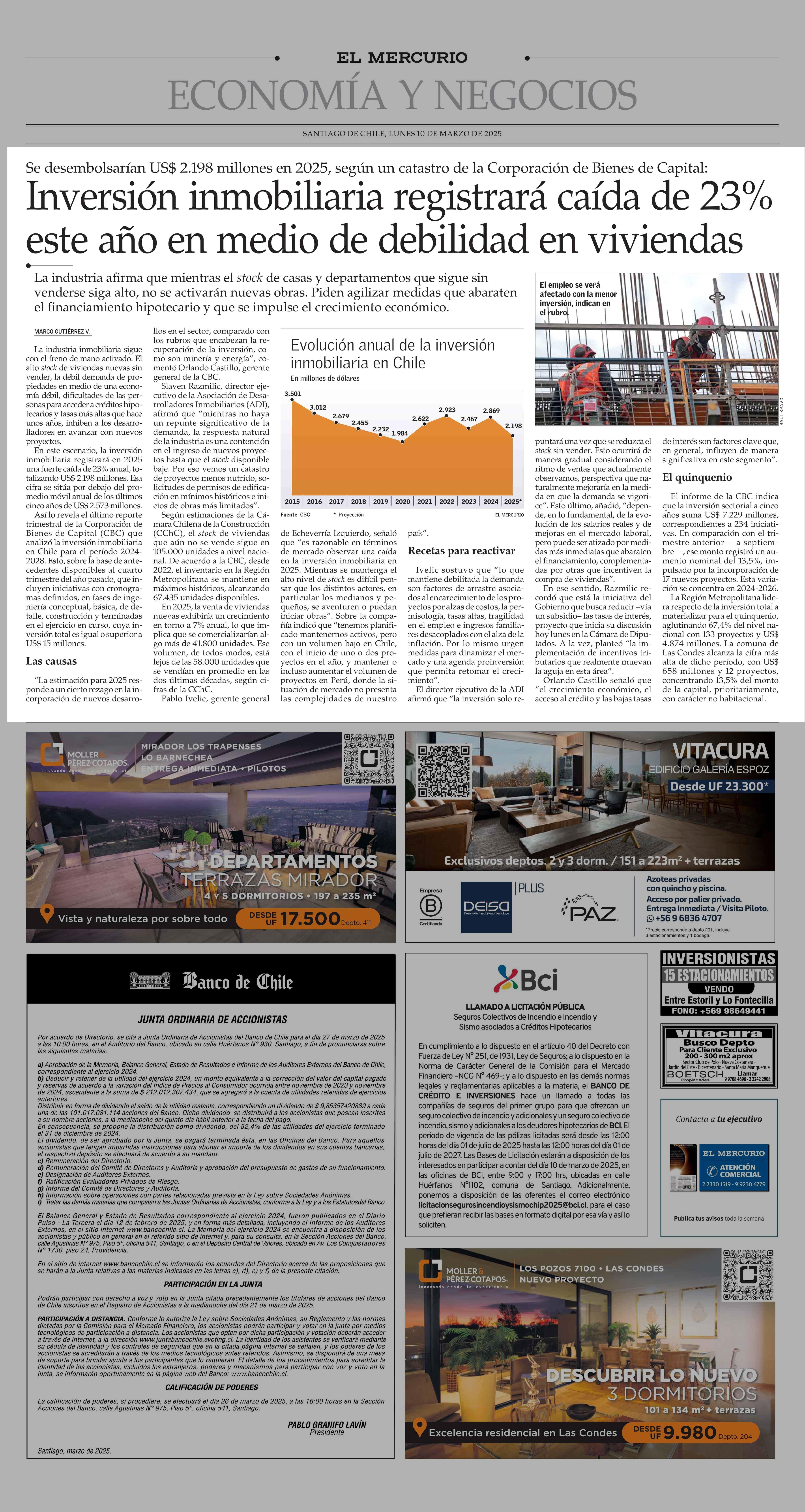 Inversión inmobiliaria registrará caída de 23% este año en medio de debilidad en viviendas 10-03-2025 El Mercurio |