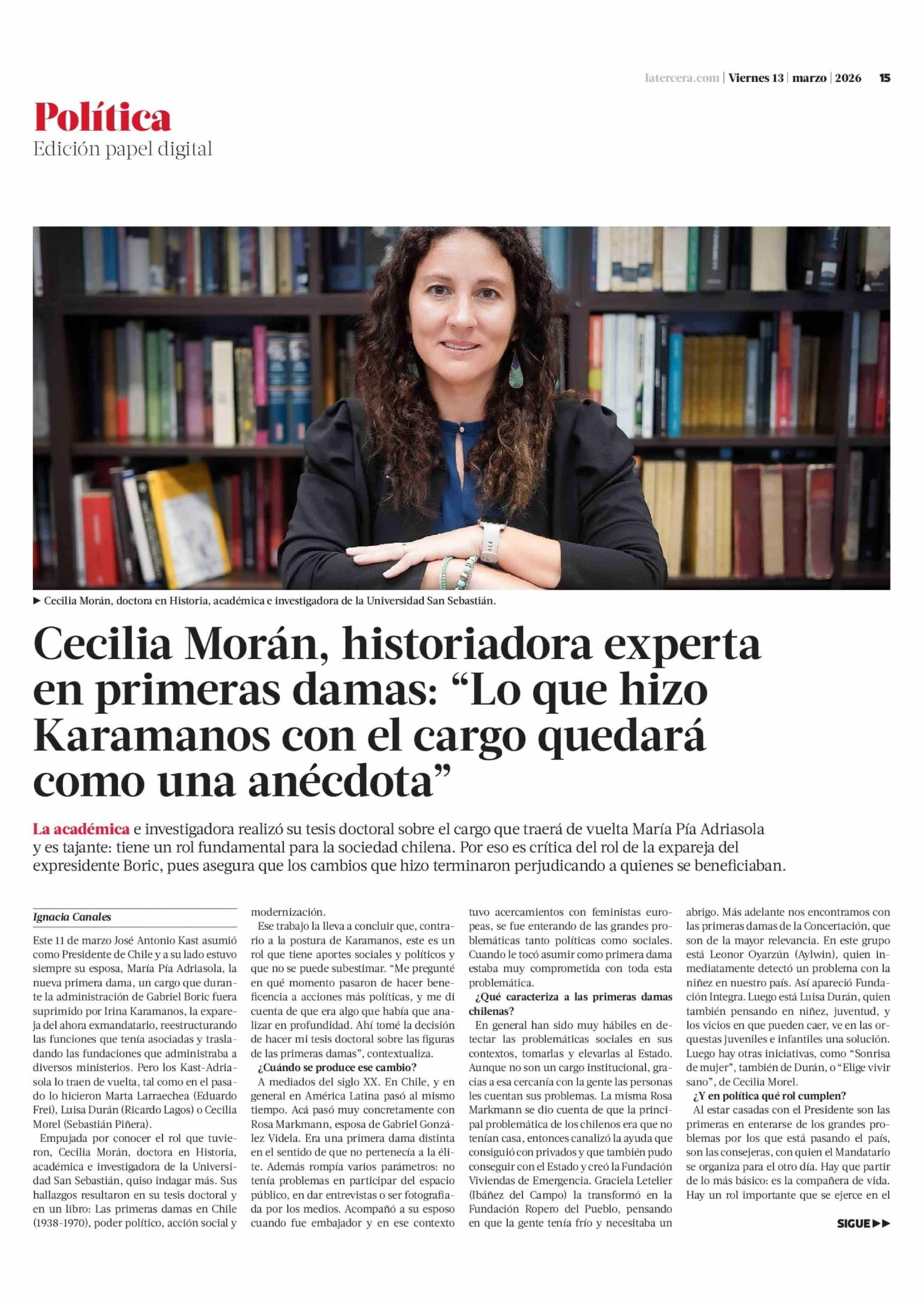 Título: Cecilia Morán, historiadora experta en primeras damas: “Lo que hizo Karamanos con el cargo quedará como una anécdota”