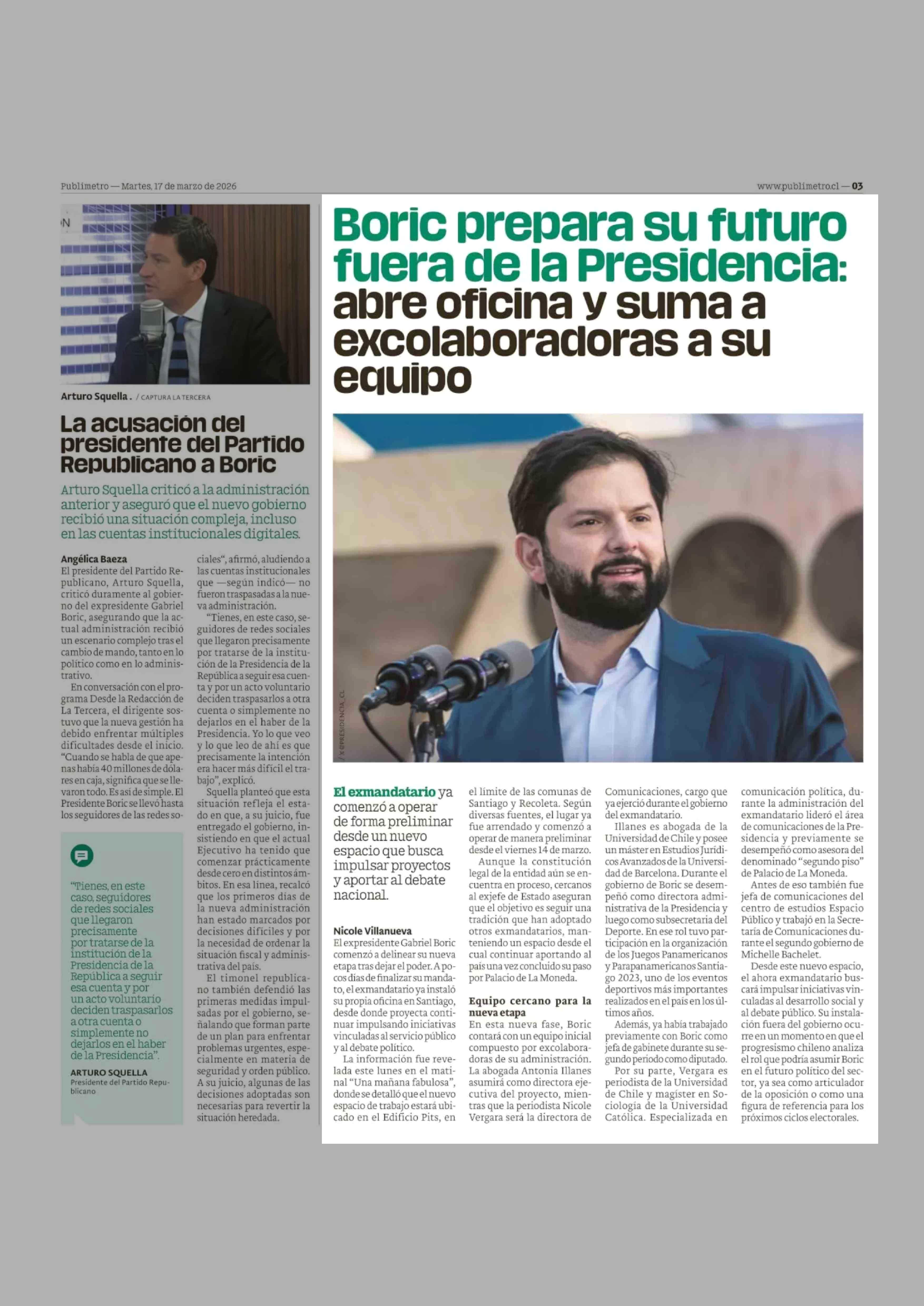 Título: Boric prepara su futuro fuera de la Presidencia: abre oficina y suma a excolaboradoras a su equipo