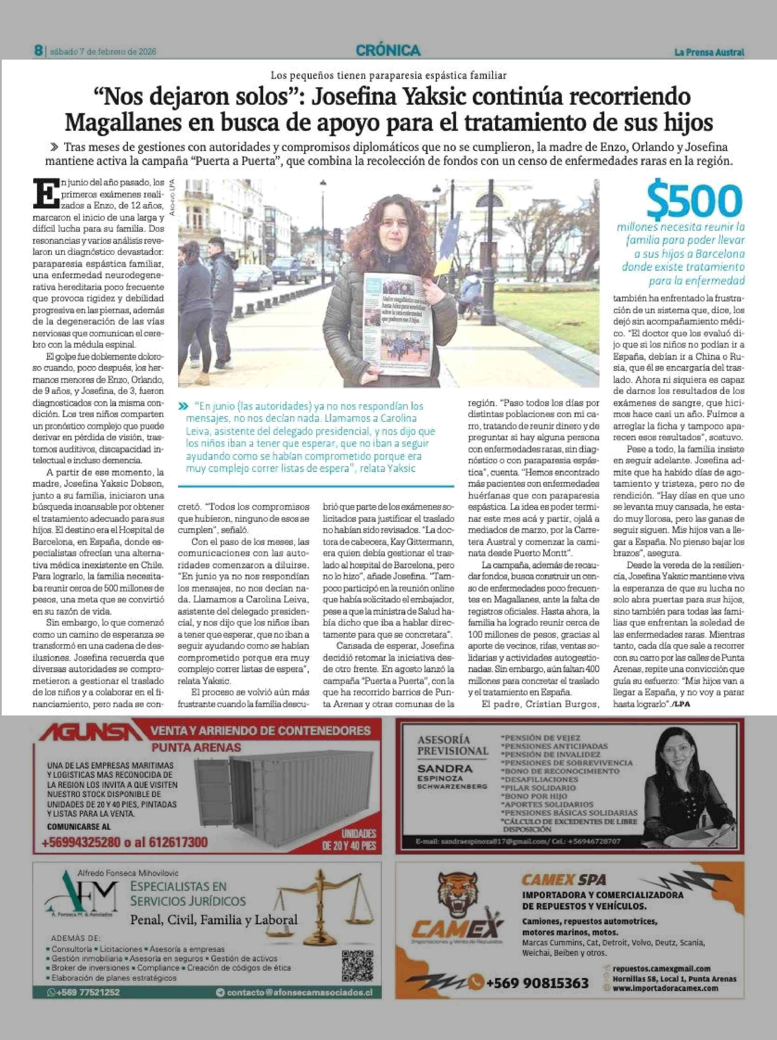 Título: “Nos dejaron solos”: Josefina Yaksic continúa recorriendo Magallanes en busca de apoyo para el tratamiento de sus hijos