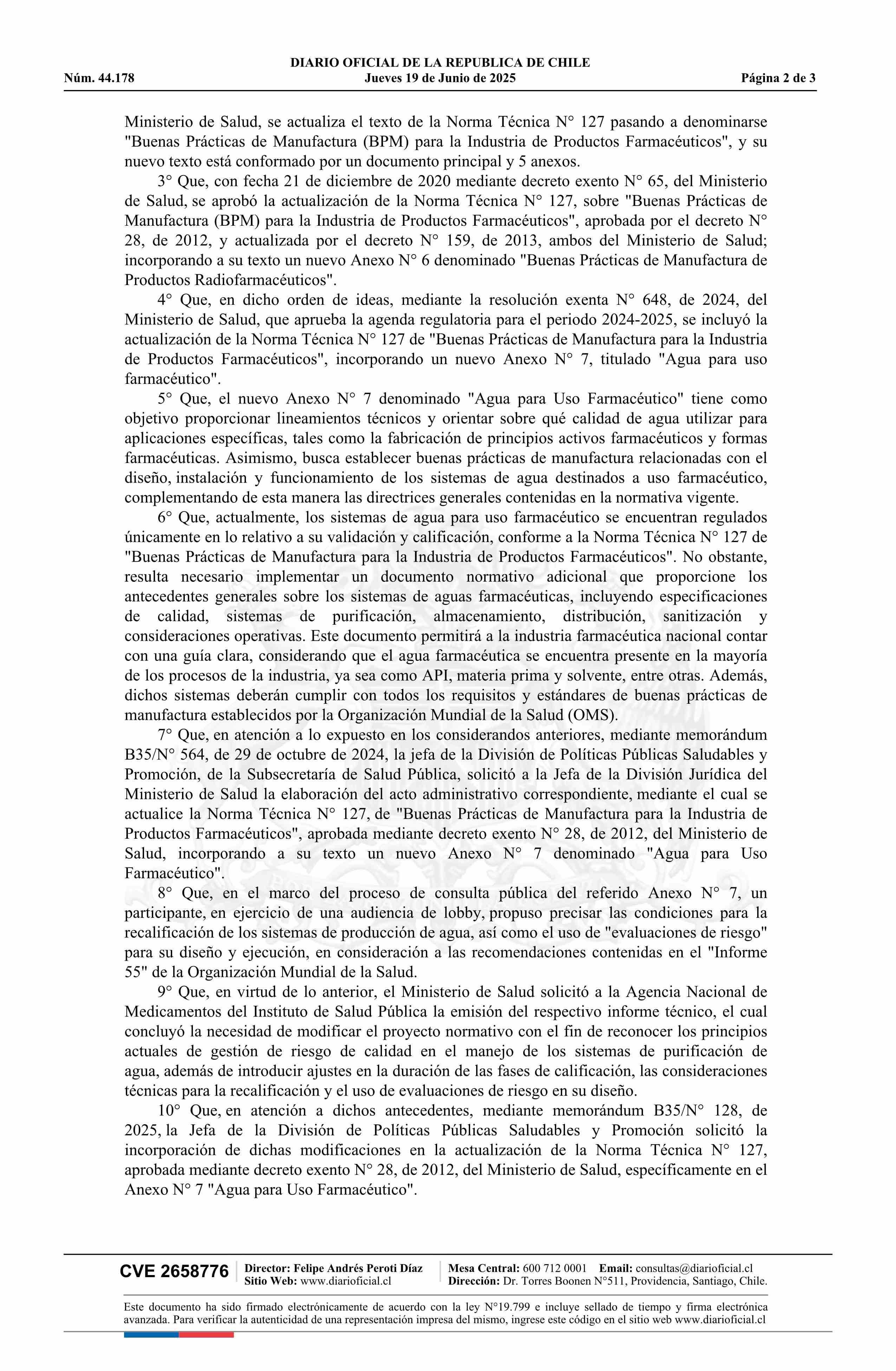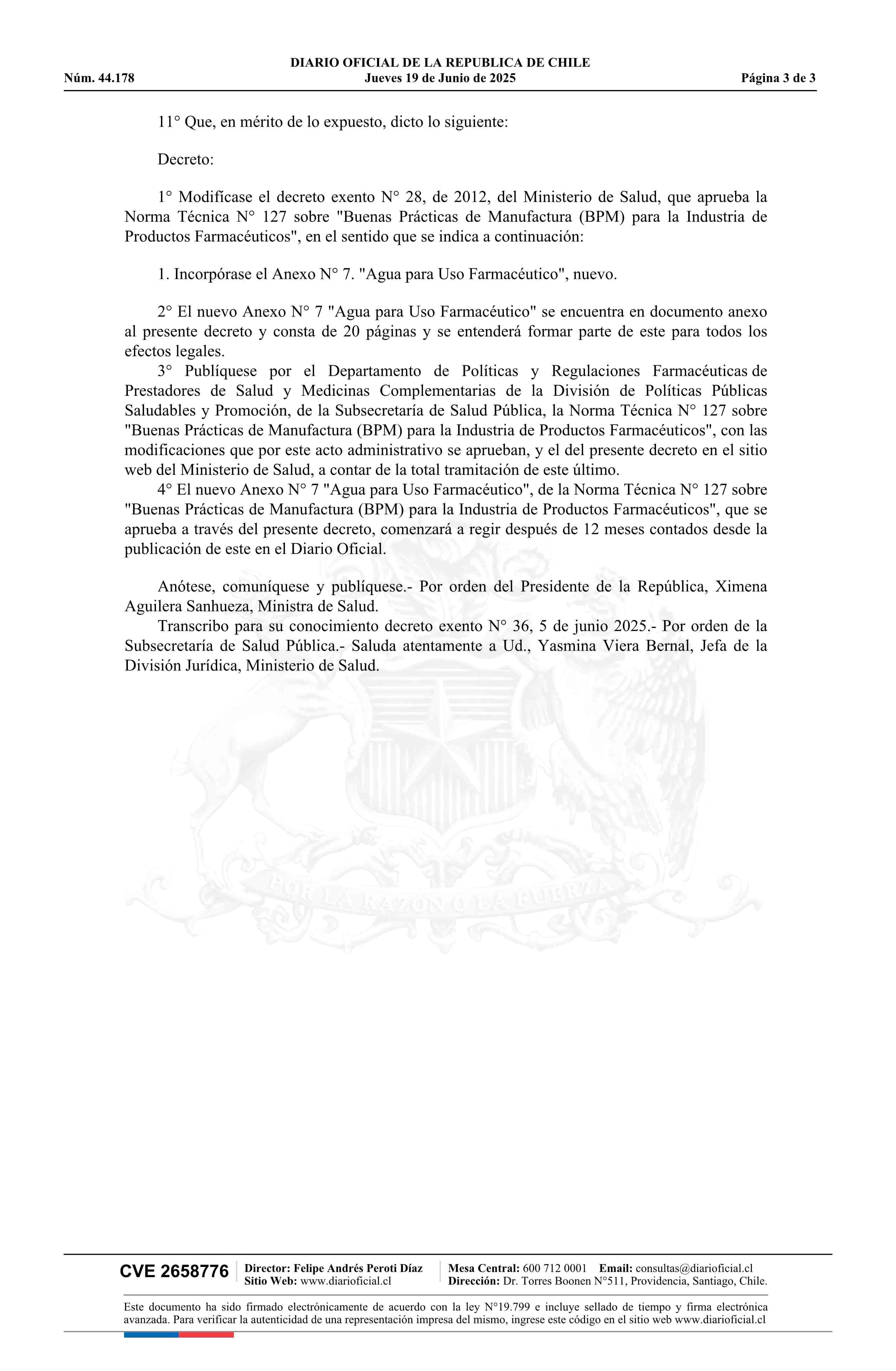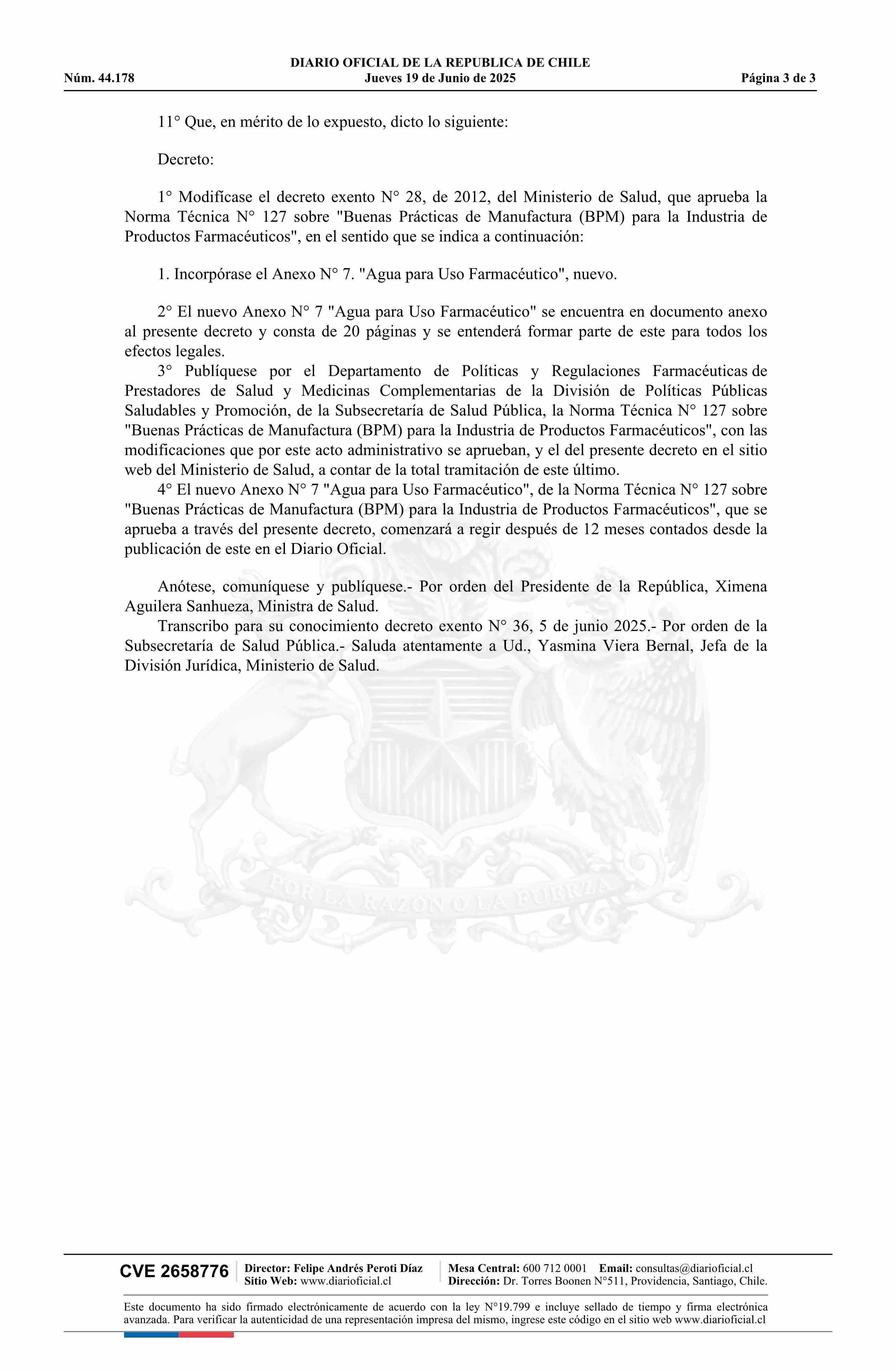 | Título: | Decreto exento número 36, de 2025.- Modifica el decreto N° 28 exento, de 2012, que aprueba la Norma Técnica N° 127 sobre Buenas Prácticas de Manufactura para la Industria de Productos Farmacéuticos, relacionada con el decreto N° 3, de 2010, mediante el cual se aprobó el Reglamento del Sistema Nacion |