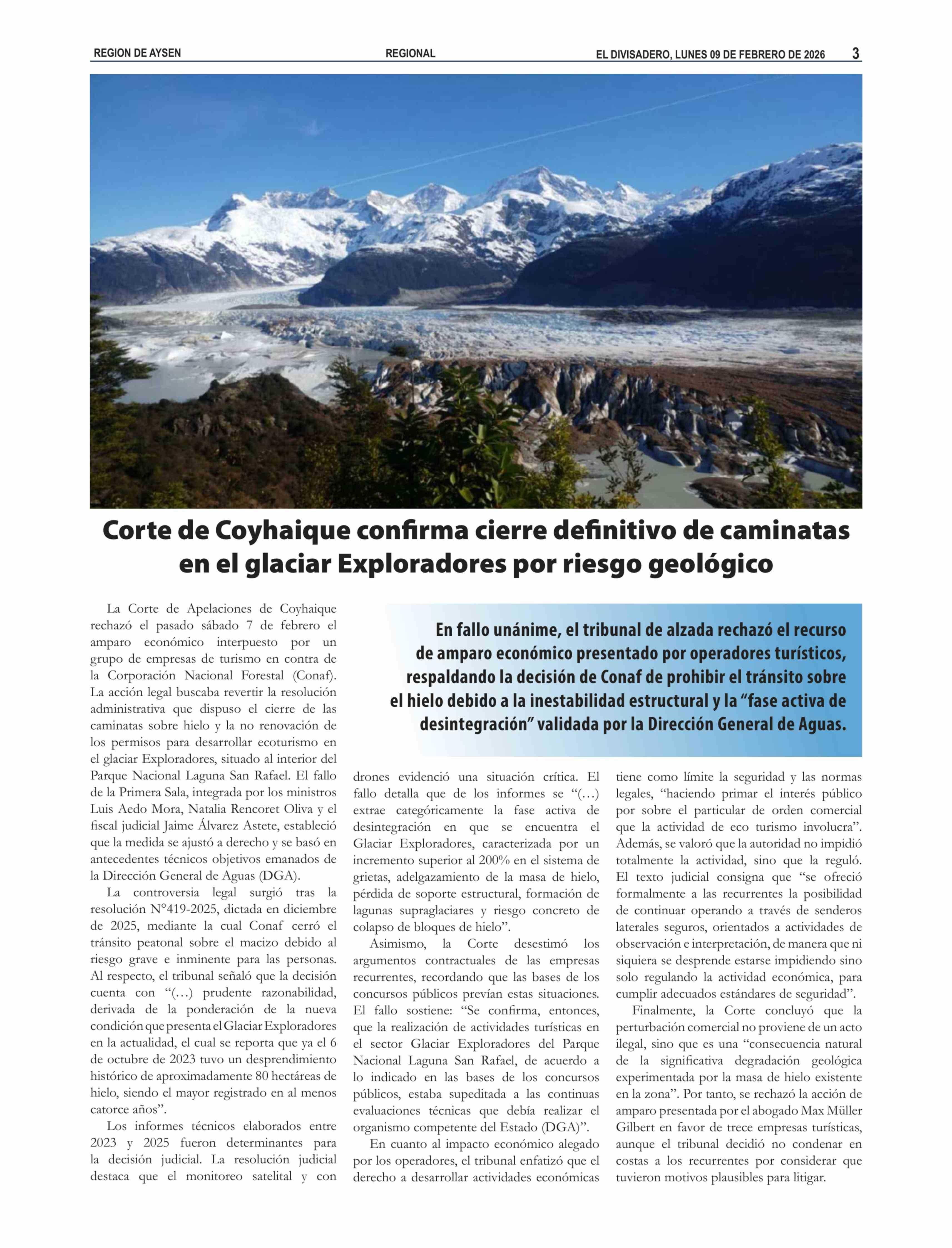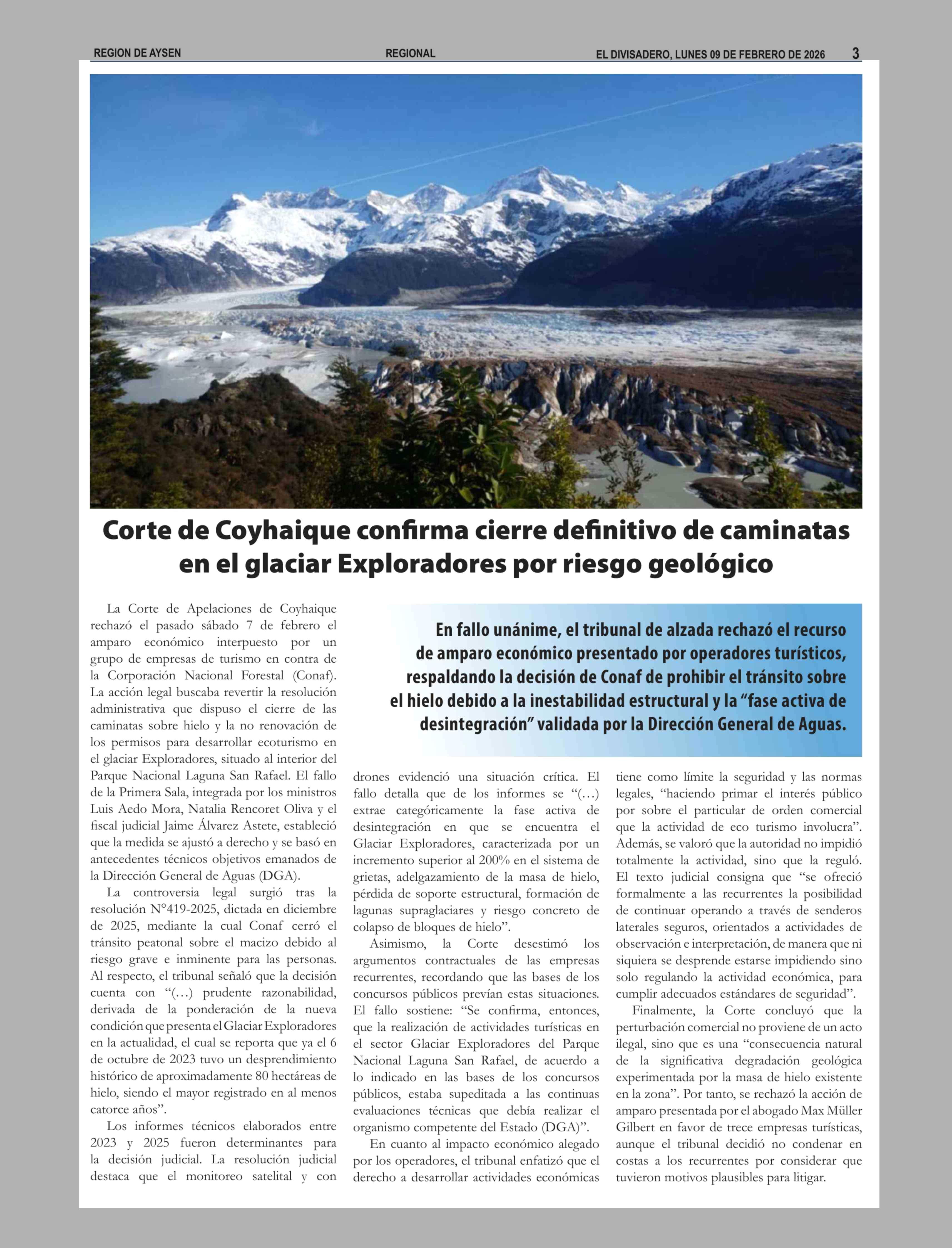 | Título: | Corte de Coyhaique confirma cierre definitivo de caminatas en el glaciar Exploradores por riesgo geológico |