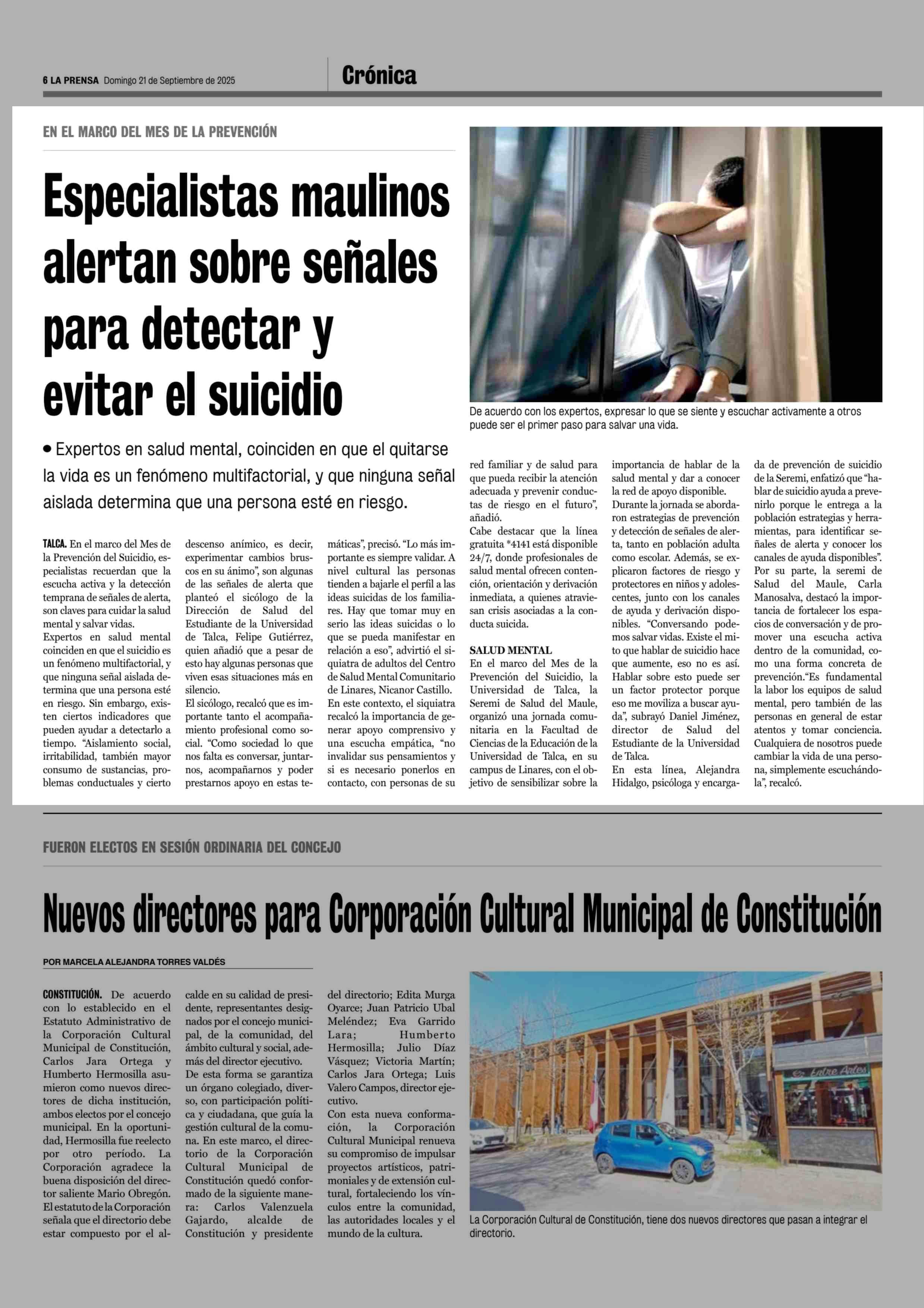 Especialistas maulinos alertan sobre señales para detectar y evitar el suicidio 21-09-2025 La Prensa de Curicó |