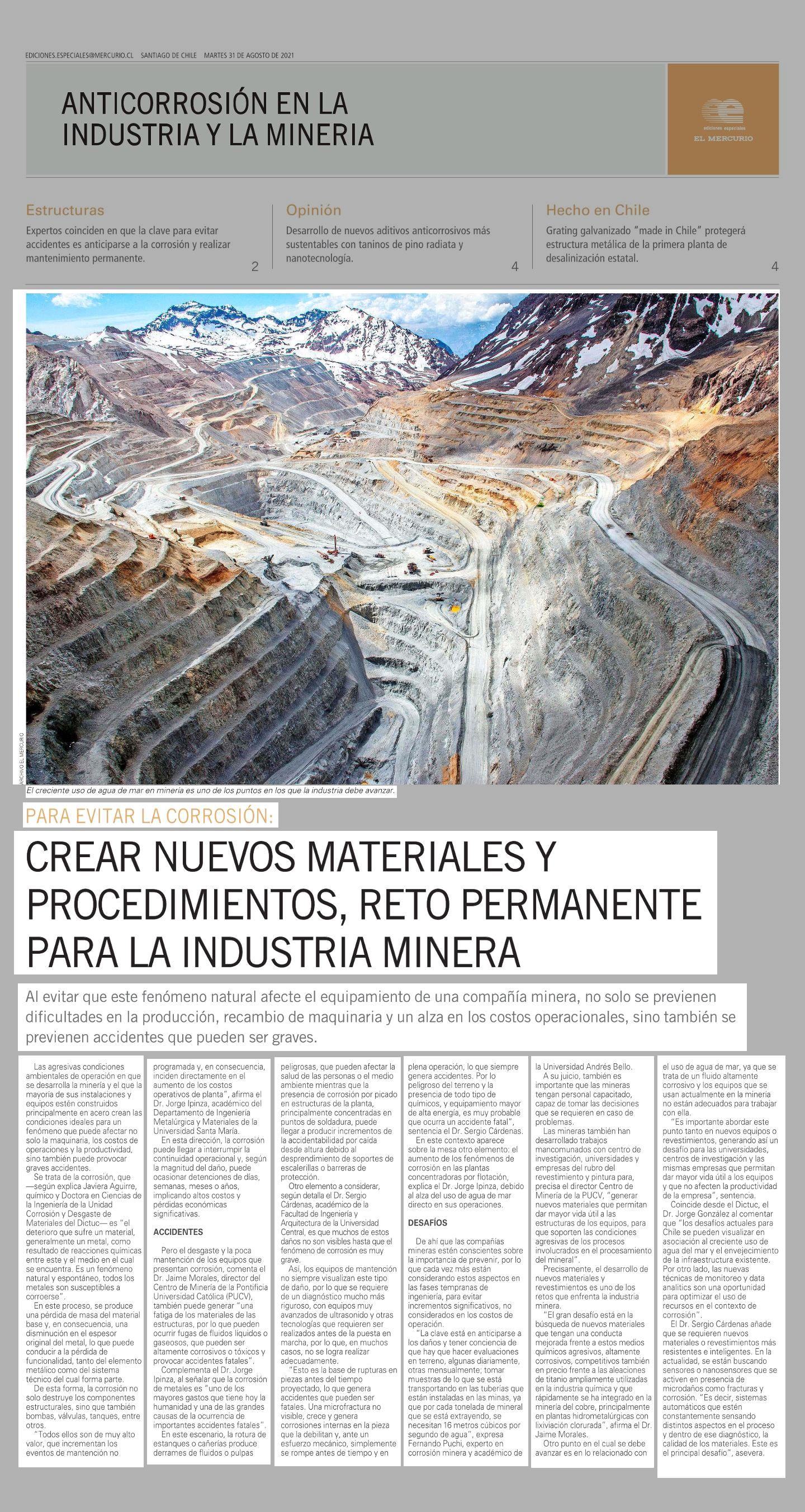 CREAR NUEVOS MATERIALES Y PROCEDIMIENTOS, RETO PERMANENTE PARA LA INDUSTRIA MINERA 31-08-2021 El Mercurio |