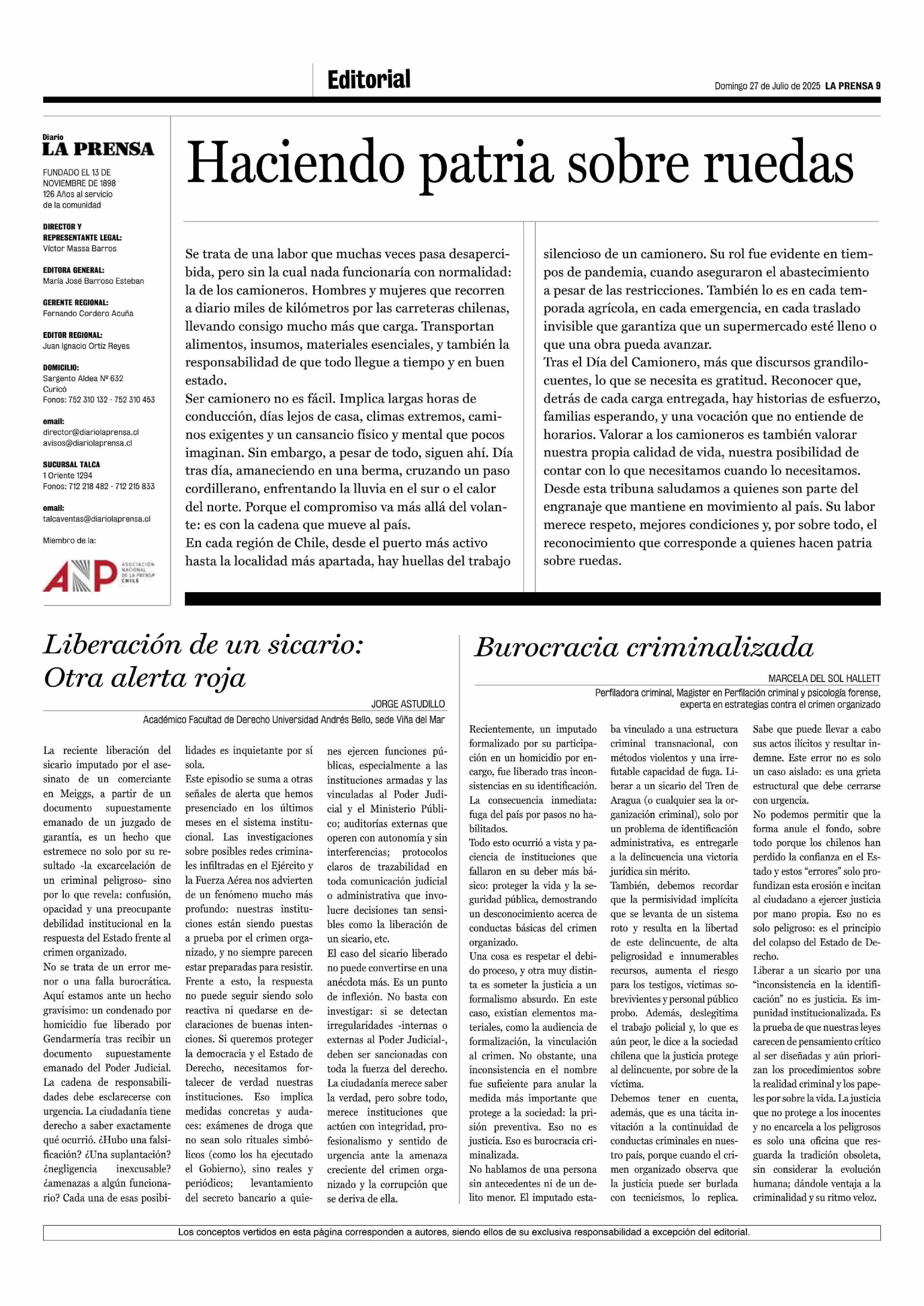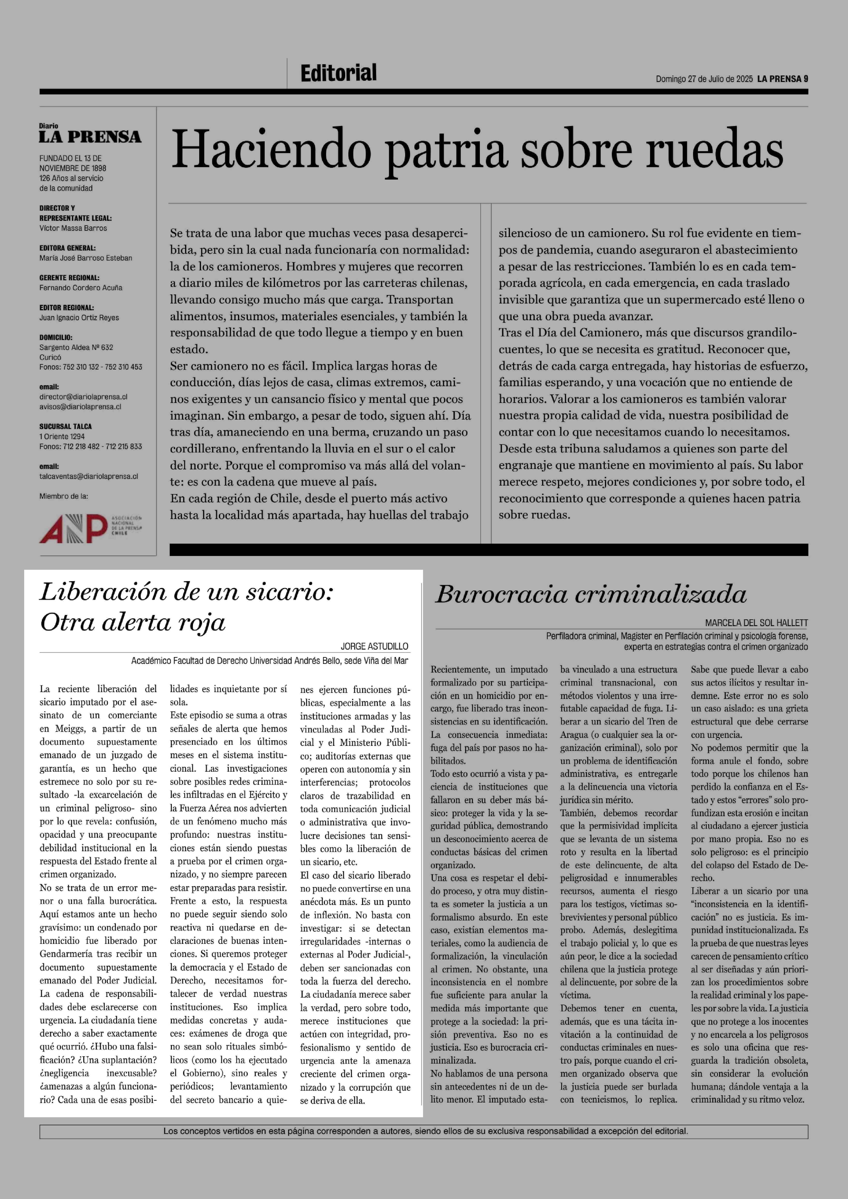 COLUMNAS DE OPINIÓN: Liberación de un sicario: Otra alerta roja 27-07-2025 La Prensa de Curicó |