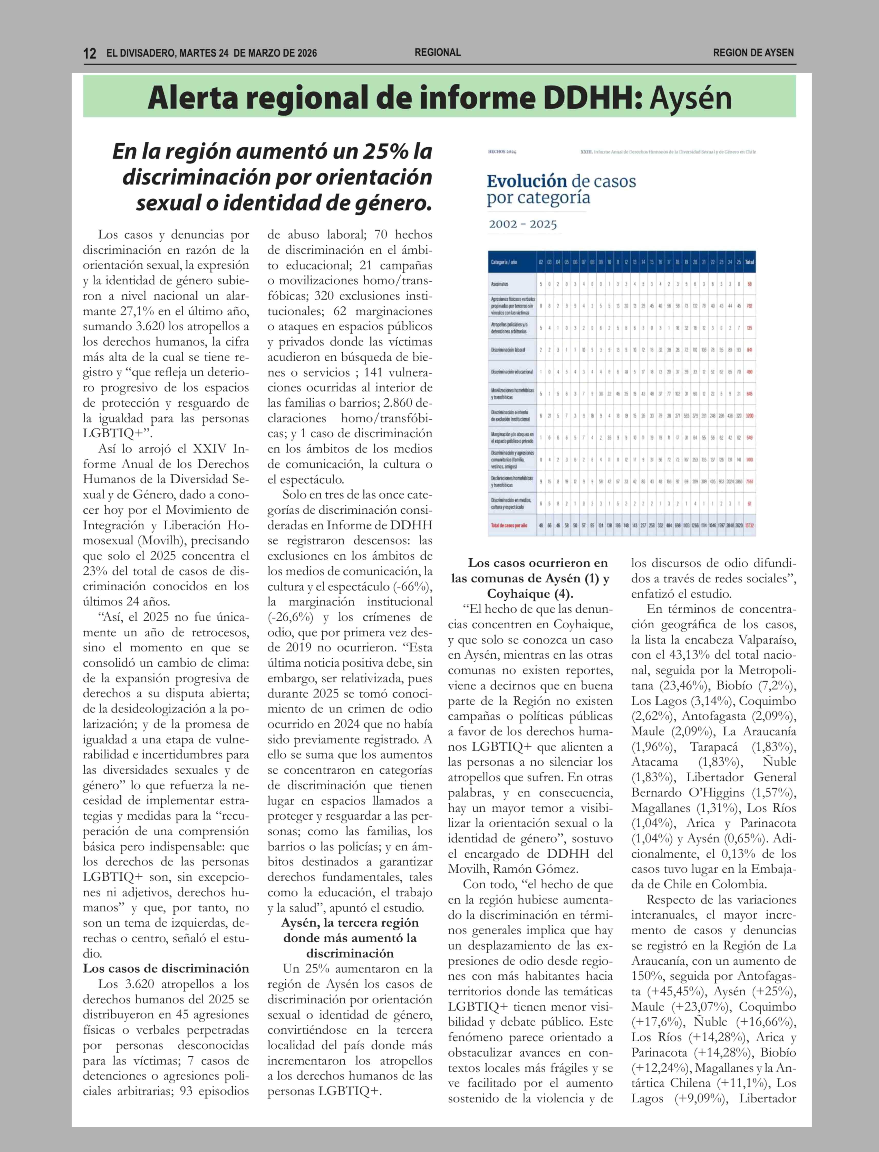 Alerta regional de informe DDHH: Aysén Aumenta casos y denuncias por homo y transfobia 24-03-2026 El Divisadero |