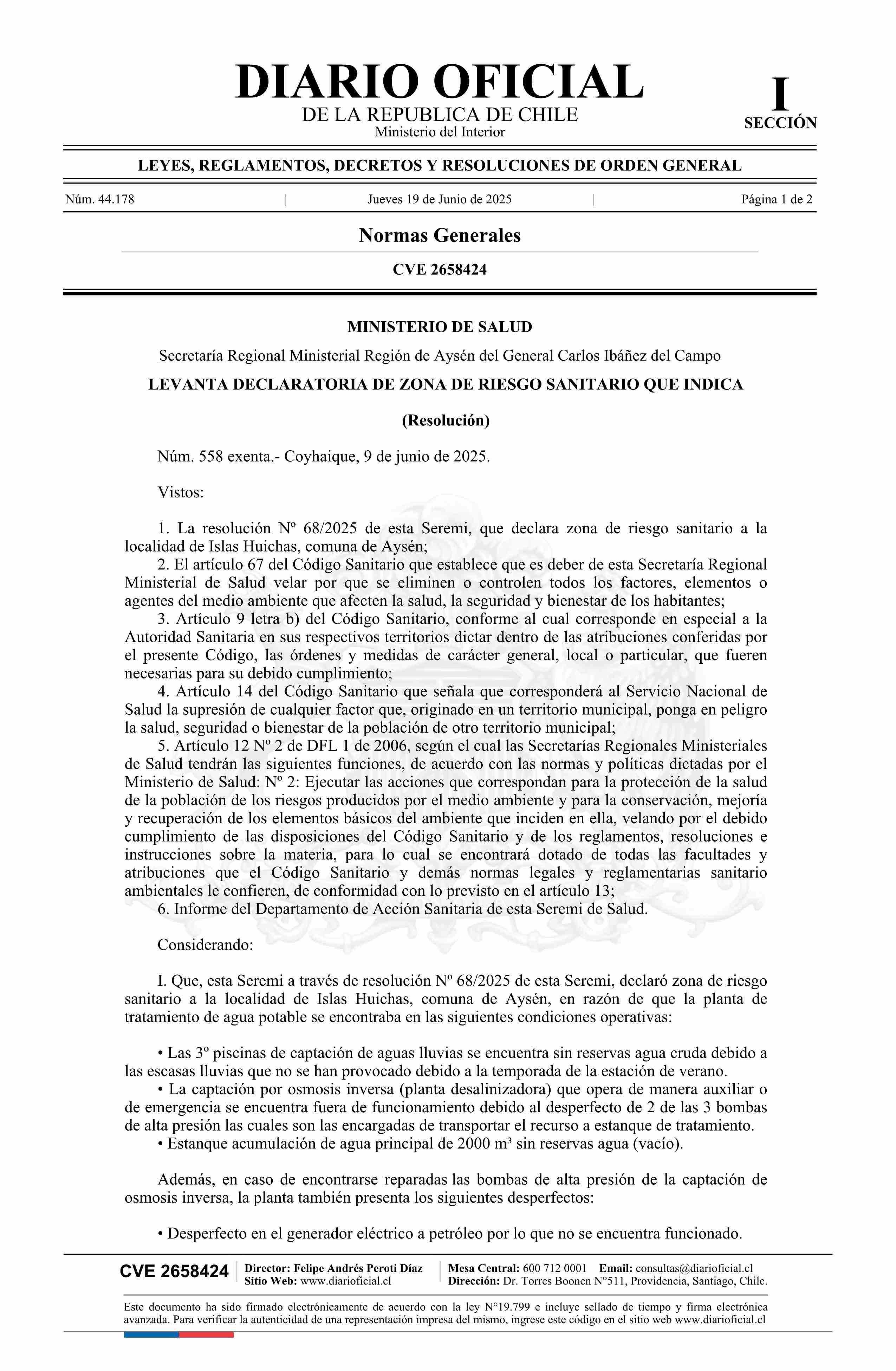 Resolución exenta número 558, de 2025.- Levanta declaratoria de zona de riesgo sanitario 19-06-2025 Diario Oficial Edición Electrónica |