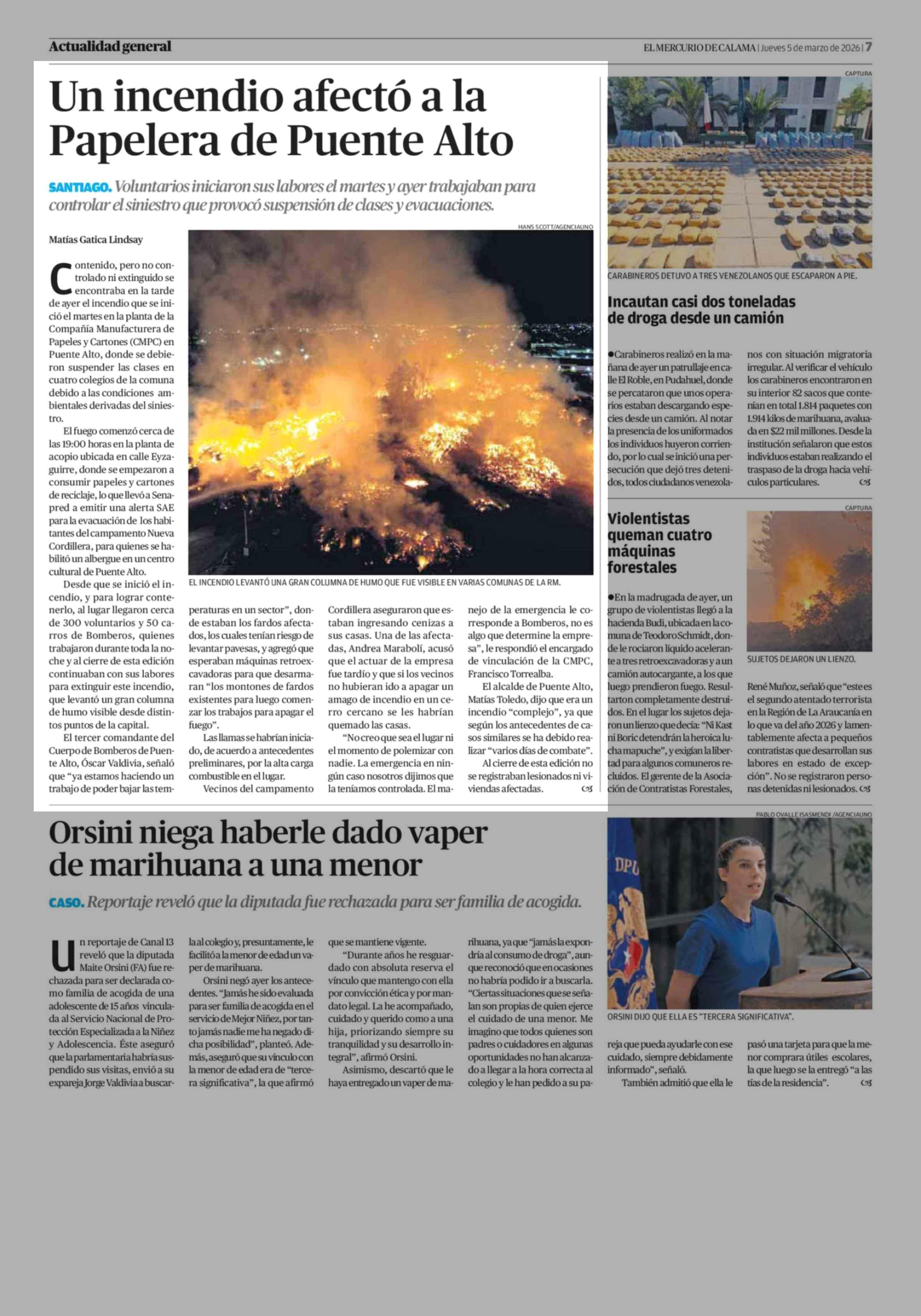 Un incendio afectó a la Papelera de Puente Alto 05-03-2026 El Mercurio de Calama |