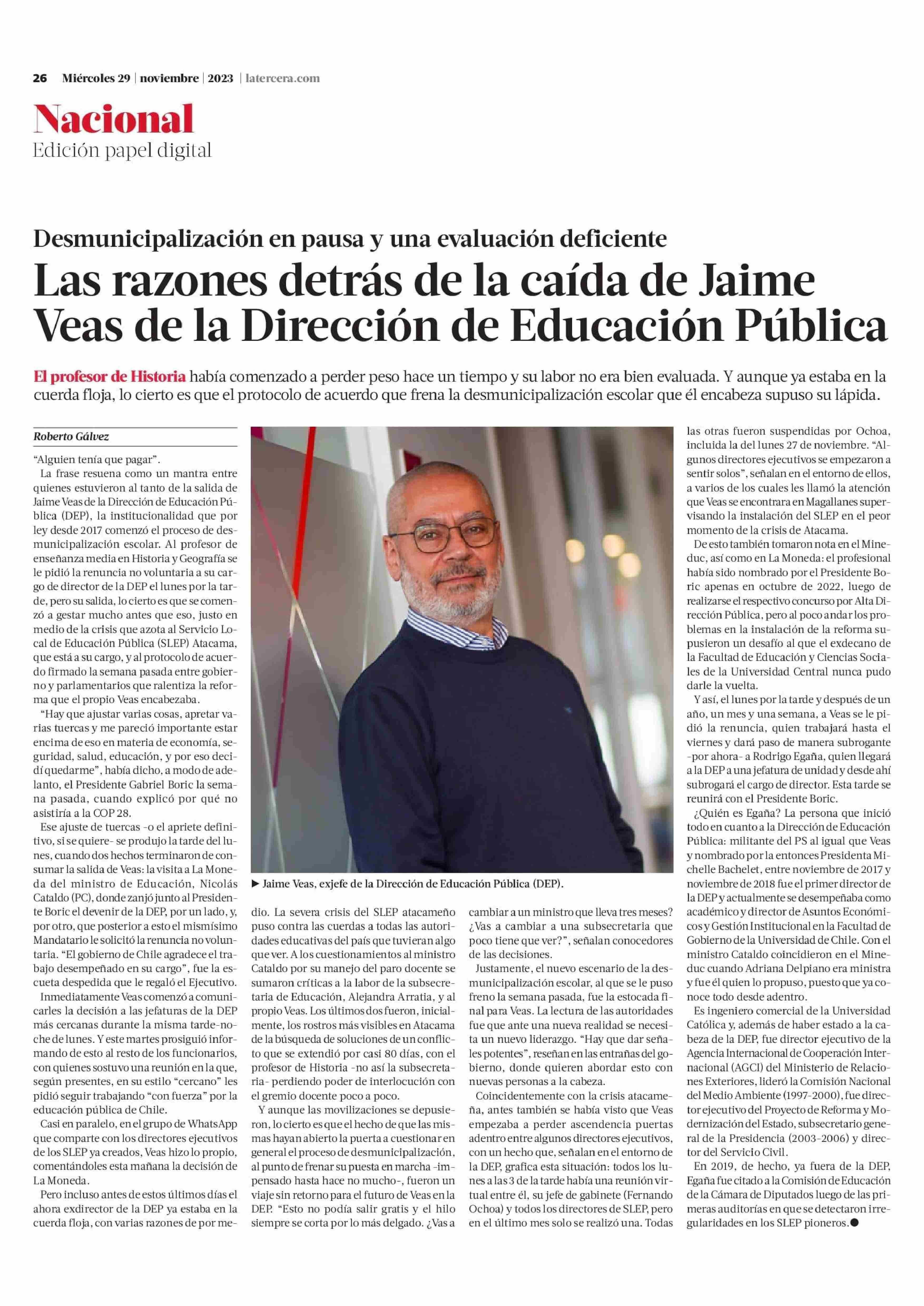 Las razones detrás de la caída de Jaime Veas de la Dirección de Educación Pública 29-11-2023 La Tercera |