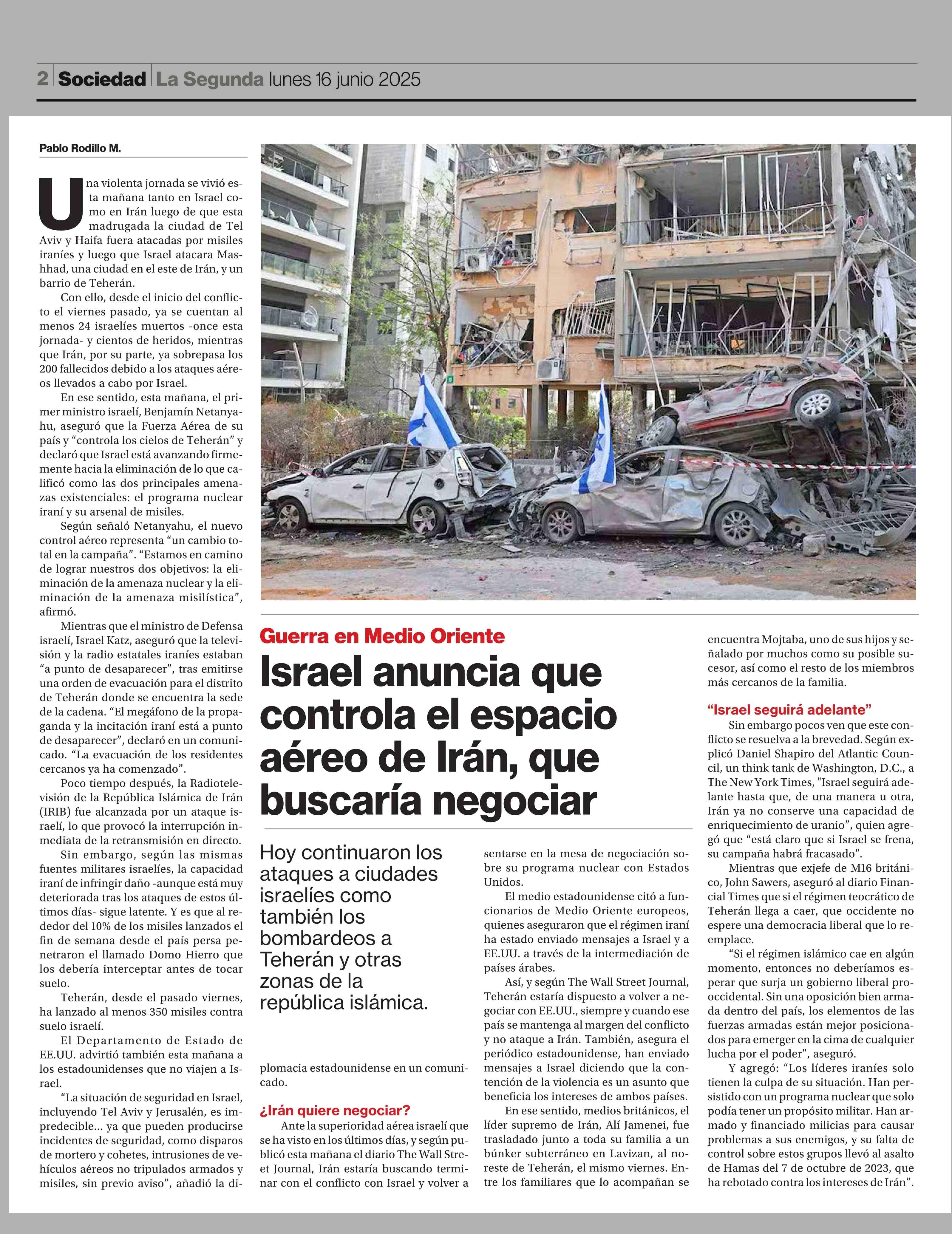 Israel anuncia que controla el espacio aéreo de Irán, que buscaría negociar 16-06-2025 La Segunda |
