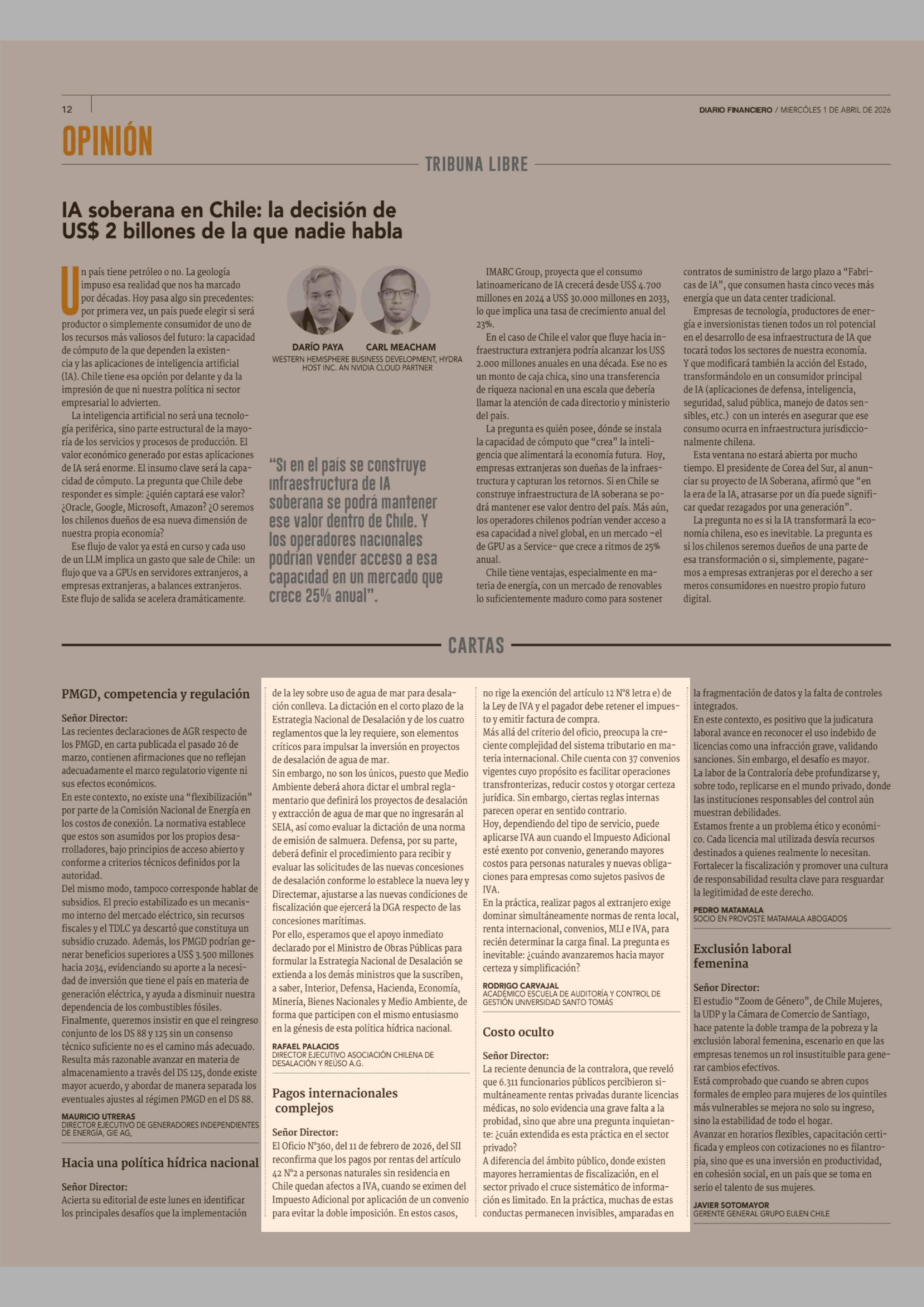 Cartas: Pagos internacionales complejos 01-04-2026 Diario Financiero |